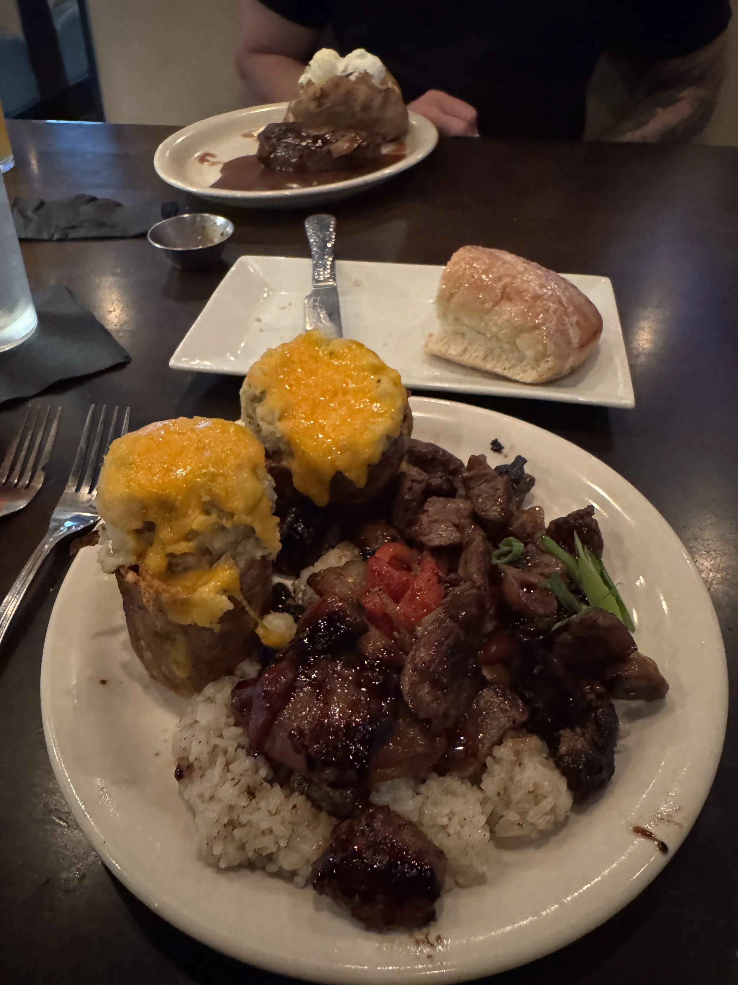We both started with fresh salads before moving on to our steaks. I ordered the Umami steak, while he went with a red wine sauce preparation. For sides, I had the twice-baked potato and he chose the loaded baked potato — both were hearty and flavorful.