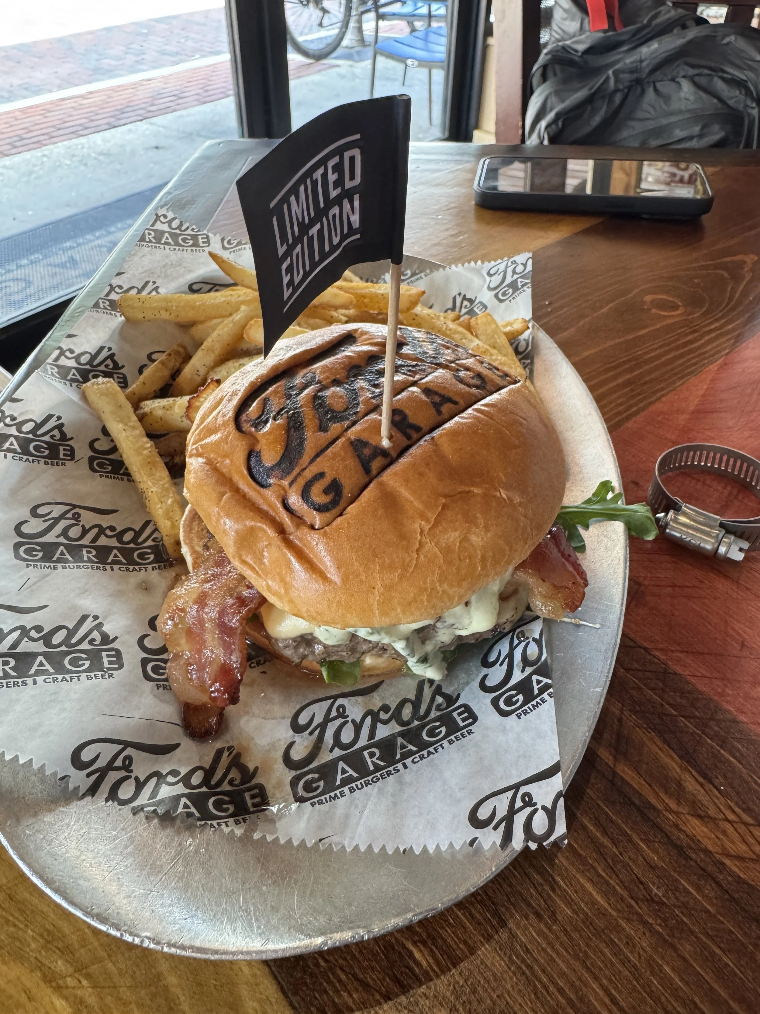 While there, we stopped for lunch at Ford’s Garage, a restaurant fully themed around Ford Motors — and they’ve done an incredible job with the details. From the Model T perched above the bar to the carefully designed automotive décor, the theme runs throughout the restaurant but never feels overdone or tacky.