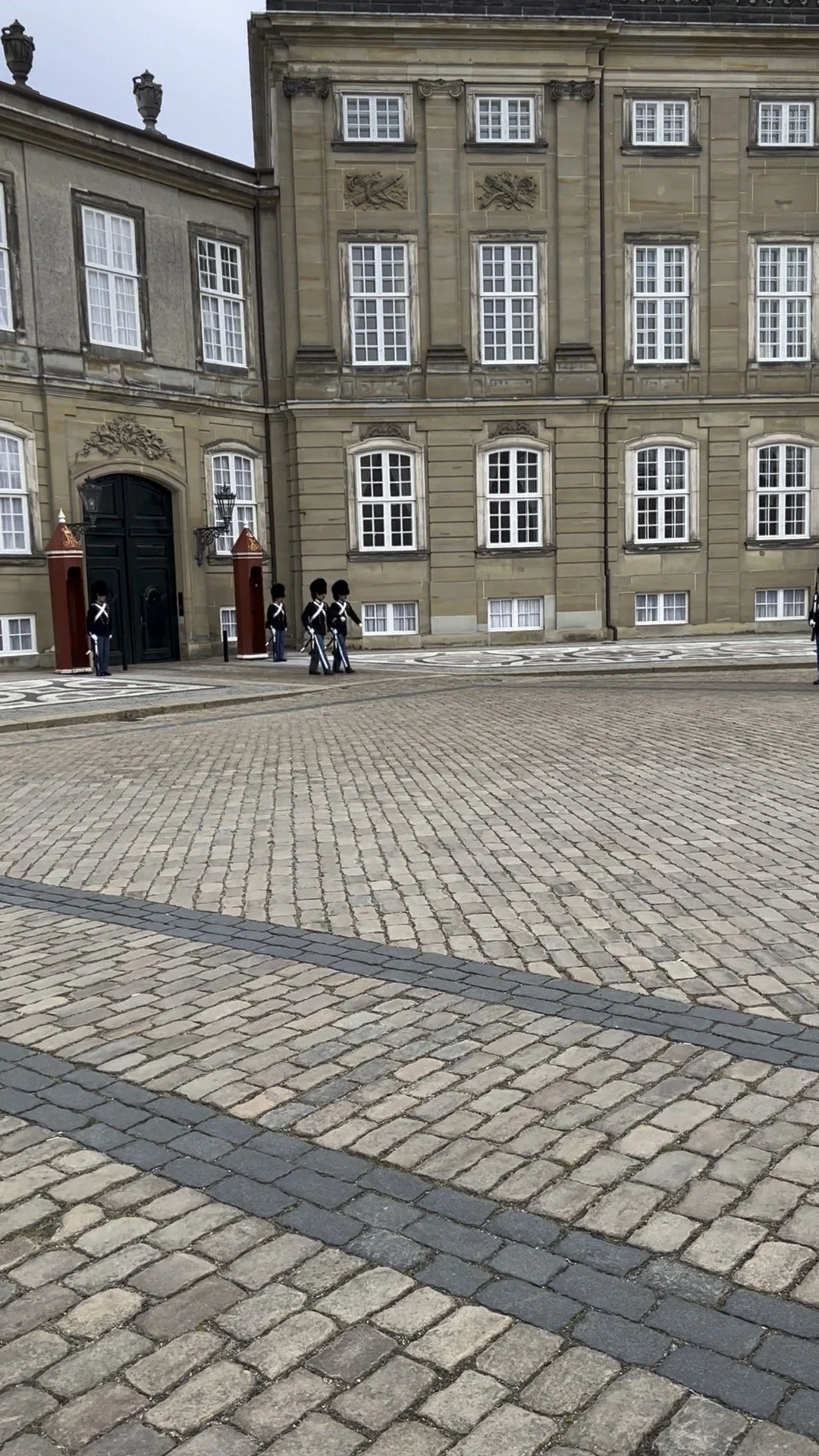 It was lunch so we decided to find one of the docked boats for lunch. We ate at Kutteren HM800 Jammerbugt: Built in 1975 at the Lemvig Skibsværft in Denmark, it initially served as a sturdy fishing vessel in the North Sea, navigating the waters of Skagerrak and the Jammerbugt (Jammer Bay). It mostly had burgers and fried food but it was a nice view from the upper deck and the staff was nice. Plus, when in Denmark it only seemed fitting to have this experience. So A+ experience and C food. Now that we were fueled, we were ready to kick it into high gear. We wandered to Amalienborg Palace where we caught the changing of the Guards march. Amalienborg Palace started as posh homes for nobles in the 1750s, but a royal fire turned them into the Danish royal residence by the 1790s. The actual palace was not nearly as interesting as Christianborg and we were glad to have the passes and didn't actual pay to enter. We caught a glimpse of Fredrick's Church while walking up Frederiksgade.