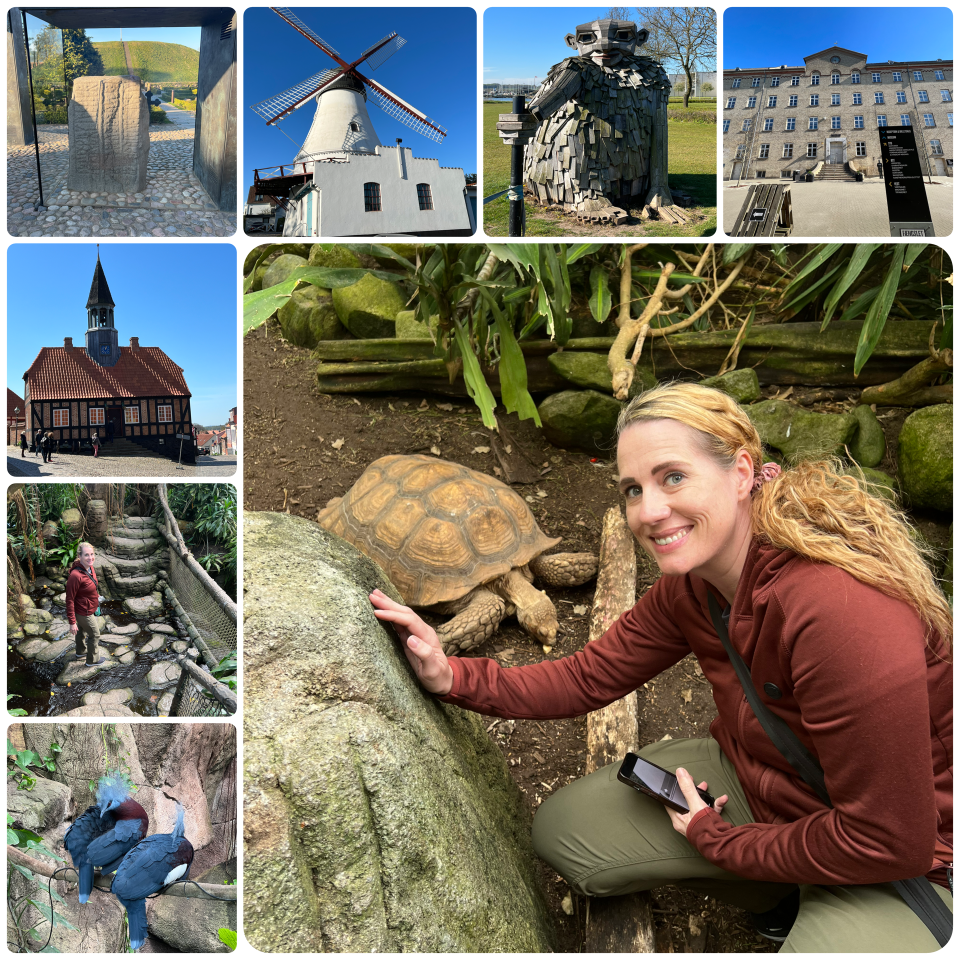 We cruised to Jelling and checked out a church there. Again, it has a well maintained and beautiful cemetary. The site also had a Danish Runic 41: The Jelling stones were erected by King Gorm the Old and his son King Harald Bluetooth. They are considered pivotal in Danish history as they mark the transition from Norse paganism to Christianity in Denmark. We headed to Vejle to see a historic windmill is a traditional Danish windmill, likely dating back several centuries. Windmills have played a significant role in Denmark's history, primarily used for grinding grain into flour and aiding in agriculture. It is no longer in use but an easy detour to see some history. While in town, we took a drive through Deer Park Vejle. We only has the pleasure of seeing a few deer and it was from a distance. The road took us to Horsens next to see a public art sculpture in Langelinieanlaegget. It's two large troll statues and it was a pretty impressive site. We made a stop at Faengslet which is a prison museum: The prison was designed by the architect Michael Gottlieb Bindesbøll in a distinctive Neo-Romanesque style. It was in operation for almost 150 years and was decomissioned in 2006. It was unfortunately closed for tours on the day we arrived but they did allow use to walk around the perimeter and the gift shop was open. We continued on to Ebeltoft which dates back to a 12th century fishing village. It is now a scenic historic town. We wandered around and enjoyed the historic buildings and uneven stones streets. The highlight of the day was Rander's Rainforest: which isn't a normal zoo but rather a tropical zoo and botanical garden housed in large domes. It aims to recreate the environment of a rainforest with exotic plants and animals. You move through different biodomes aimed to mimic the environments of the animals/plants that they house. A lot of the animals roam freely but obviously the predators are seperated and a bit more contained. We had so much fun here and it was definitely unique.