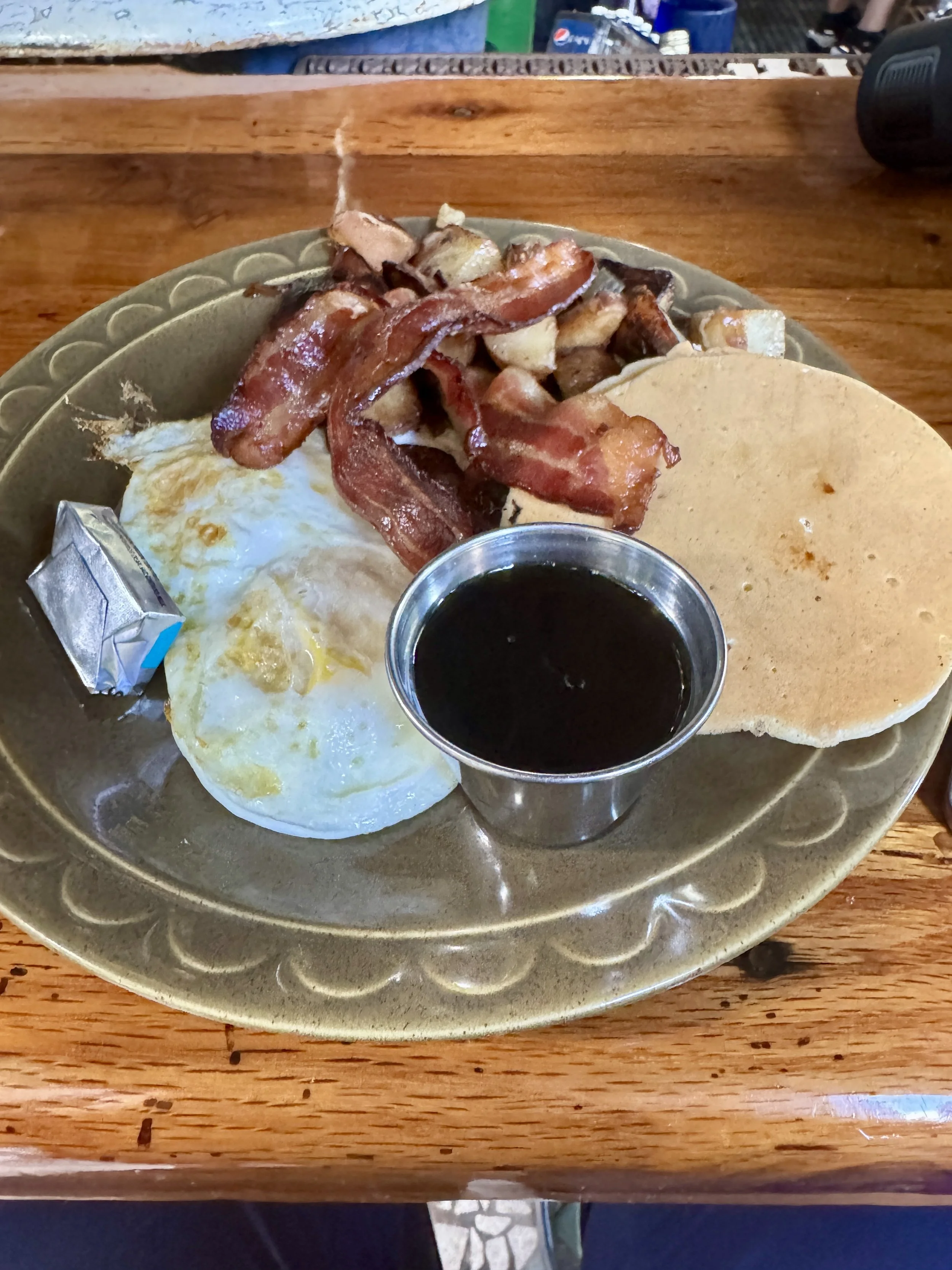 We walked up to Blue Heaven for breakfast. They had some live music and were pretty busy. Tables had a 20 minute wait, but we were able to sit at the bar. I had eggs, potatoes, bacon, and sausage. It was all really good and the service was great despite the busy environment. The music was easy listening and at a good volume.