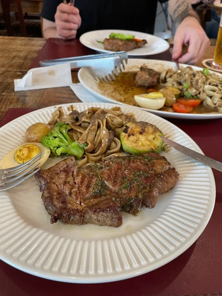 The dining experience is fast-paced and rodízio-style—basically, an all-you-can-eat Italian feast. You sit down, and servers immediately start bringing out shared dishes while several others circulate with trays of additional options. The endless flow of pastas, meats, polenta, and vegetable-based sides is incredible… and, yes, we definitely overate a bit.