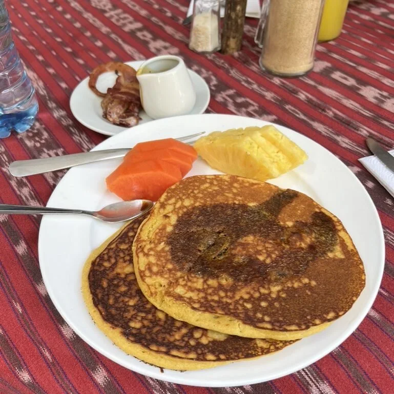 By the time we finished dinner, jet lag and exhaustion had officially set in. We were back in our room by 7:30 PM and immediately passed out. There’s no A/C, but the temperature dropped enough to sleep with the windows open—until a lively midnight conversation started outside our room. Luckily, pure exhaustion won, and we were back asleep quickly.