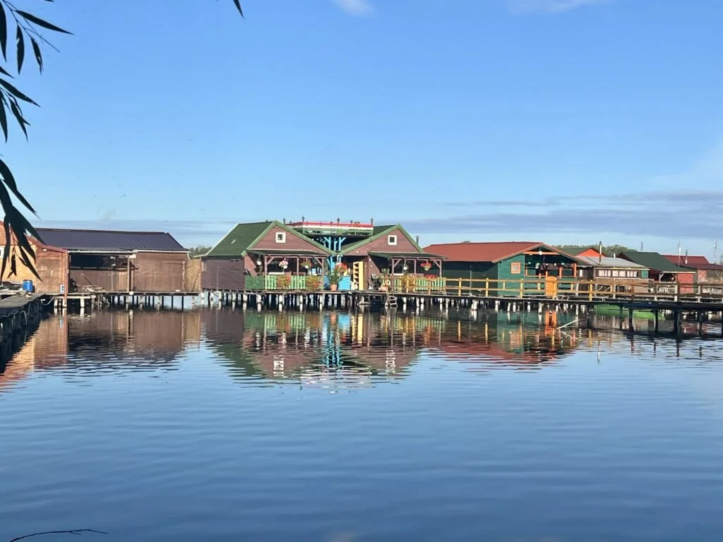 Stop 2: was heading South to the middle of nothing. The roads were a bit rough and the drive leading in was super narrow. A timid driver might not enjoy this one: Bokodi Floating Village. Again, nothing was open but we caught it at the right time of day for awesome views. It is basically floating fishing cabins with at least one cafe with rooftop seating. It’s worth a detour if you like more unique sights but there isn’t a lot of interaction at this one. A fun fact is that the water never freezes since a power plant uses it As a cooling pond.
