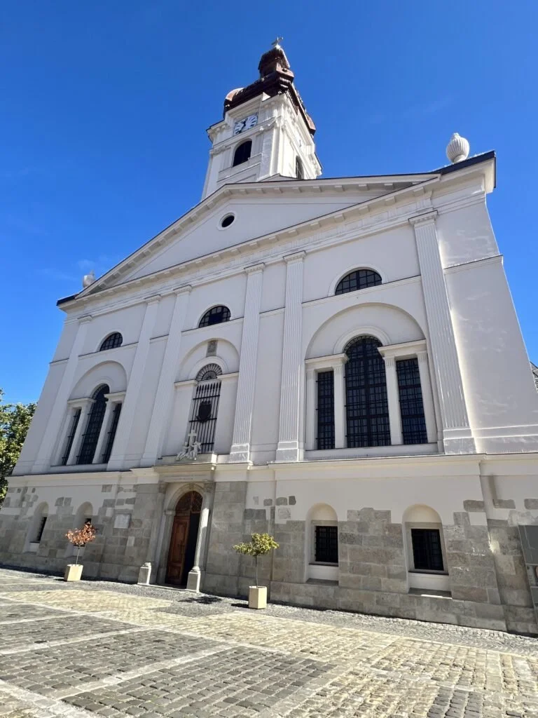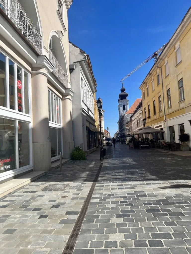 Our next stop was Gyor. Parking here is tricky without speaking Hungarian. There are signs everywhere that indicate most spots are paid parking. They have very old technology to pay (I.e. you will need COINS). Luckily, we traded some USD to the local currency and had a few coins floating around to buy 1.75 hours. We wandered through town to Matróz Dunaparti Kisvendéglő. The food had large portions. It wasn’t anything amazing but we were able to sit outside with a view of a farmer’s market which was nice. The weather was perfect. This restaurant had English menus which made ordering a bit easier. After the meal, we made a short walk to Basilica of Győr. It was still open to the public and it was ornate with gold sculptures and very high painted ceilings. The condition is remarkable. Next we headed to Bécsi kapu tér to see the colorful buildings in the area and wandered into a few touristy shops to get our first taste of available souvenirs. No purchases yet. We made it back to the car and headed further east to Sopron.