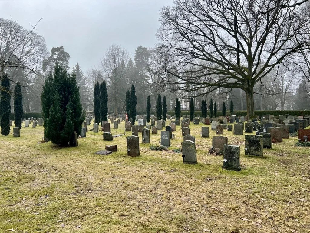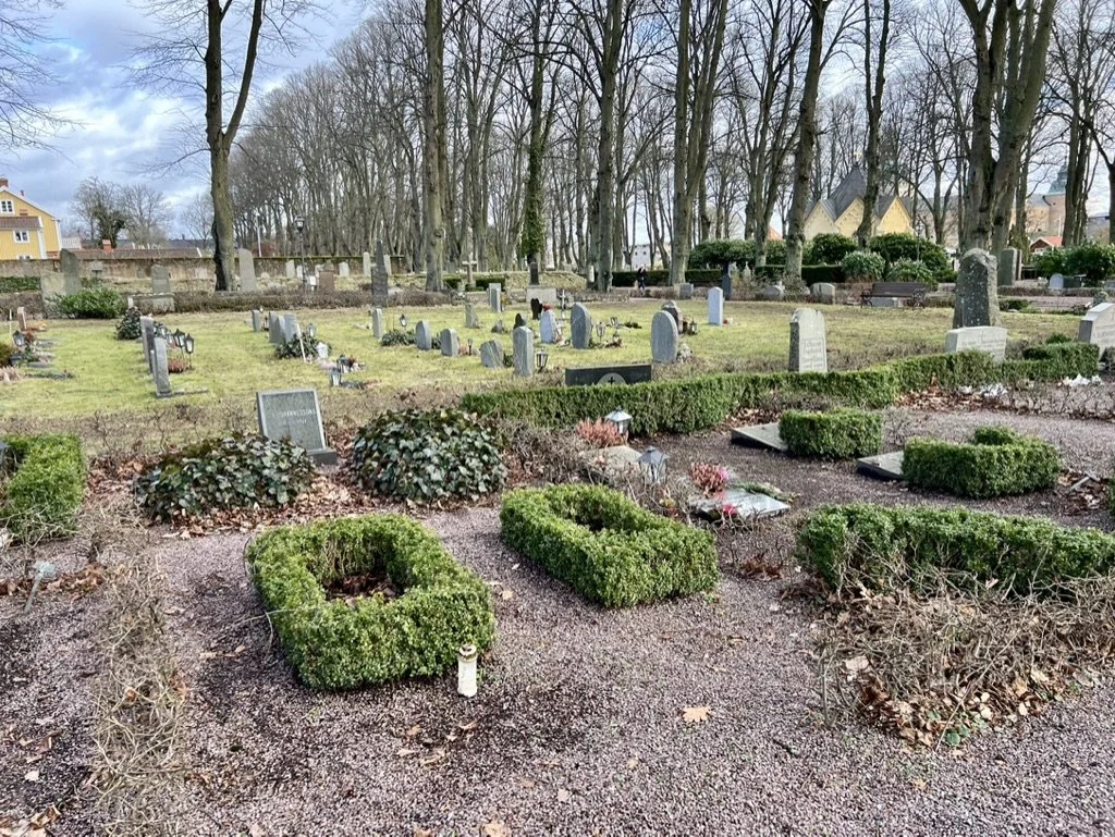Honestly, this was the least impressive castle that I've seen in Europe. The entrance is a line for tickets with a gift shop. Although, it appears that you are entering the castle, the interior is not. You must go to the second floor and wander through some museum exhibits to get to the round tower and castle entrance and even then the castle is just a set of interior steps. The inside is modestly furnished and it has random artifacts throughout without making much sense. I wasn't the biggest fan but decided to check this castle out due to the mote. Anyway, we wandered around the museum and castle for a while and then headed to the central downtown area and parked. We walked around Lilla Torg and Sodergatan Street which are both touristy shopping areas. We had lunch at Bullen Tea Krogare which had some traditional Swedish dishes and a modest menu (4 selections) for lunch. We had pasta with roast beef, and thinly sliced pork with boiled potatoes. It was all very good. The restruarant has been open for nearly 200 year and the inside was very ornate with lovely paintings on the wall, some as impressive as the castle we visited early. On the way back to the car, we walked through a park cemetery: Brunnen Gustav Adolfs torg which is named after Gustavus Adolphus (1594–1632) who was the King of Sweden known for his military successes during the Thirty Years' War. The cemetery had new and old headstones and a lot of family plots. It was a nice detour to the streets we had already walked on. Afterward, we walked to the car and drove to Trelleborg to see the Kim Memorial. This was interesting because the parking situation was nonexistent so we pulled into a small dirt area and hustled. The path was well marked but muddy on this soggy rainy day. We found the memorial easily and had our first up close sighting of the Baltic Sea. My boyfriend of course had to "try" the water and was surprised that it wasn't salty. It was cold and windy so we didn't spend much time hear and got back to the car to carry on. We detoured a bit out of the way in Ystad to see the Greyfriars Abbey: