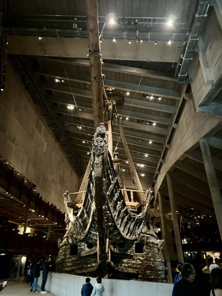 Today, we woke up to an amazing breakfast at the hotel. The spread was huge with cold cuts, cheeses, fruits, veggies, bacon, scrambled eggs, breads, meatballs, juices, pastries, etc... I mean it was unreal. We then had our longest drive of the trip: about 4 hours to Stockholm. We found parking in the downtown area, found a parking machine that was broken so we had the joy of trying to use an app. It was a process. Stockholm has a pass that you pay a rate for that gives you access to several attractions around town so we bought one. We headed straight to the Vasa Museum. It was actually pretty incredible: it is dedicated to the preservation and display of the Vasa, a 17th-century warship that sank on its maiden voyage in 1628 and was salvaged in 1961. The museum showcases the remarkably well-preserved ship, allowing visitors to explore its intricate details and learn about its history. Exhibits provide insights into maritime life, naval warfare, and the circumstances surrounding the Vasa's construction and sinking. The Vasa Museum is a popular tourist attraction, offering a unique and immersive experience into Sweden's maritime heritage. It was a crazy building that appears to be built around the ship. It was 4 stories tall and the ship is 95% original. It was a favorite stop of the day.