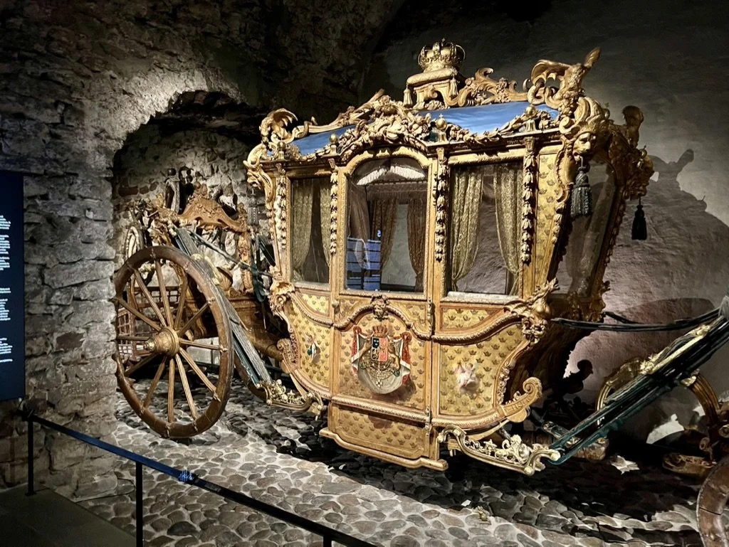 The guest apartments were interesting but the Kronor Museum was the bees knees. It included the oldest room in the castle, it was underground and had a lot of really interesting things to see including a lot of interesting facts about the castle. The guest apartments were elaborately decorated with vibrant colors and there is a lot of furniture, artwork and history to be seen as well. The treasury was small and had some of the crowns and royal jewelry on display. Next to the treasury was the armory. Now this is a separate admission but included on the Stockholm pass which should be noted. This was probably my favorite part of the Palace. It was done so well and it had royal clothing through the periods on display. I was raised on a horse farm so I particularly enjoyed seeing the items the adorned horses: saddles, body armor, saddle pads, etc. They also discuss unicorns from literature throughout history and other interesting topics. In the basement of this building is several royal carriages. This was the best part of the Palace in my opinion and I spent a descent amount of time down there.