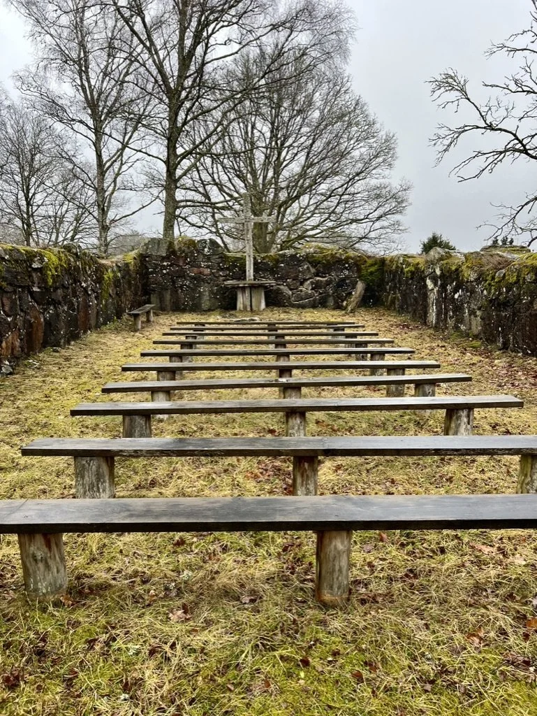 We woke up, had breakfast at the hotel: this spread was the most lux of them all. It had so many options including gluten free, non dairy, etc.. We hit the road for the trek back to Copenhagen. The first stop was Hallsjö kyrkoruin, located in Strömsund Municipality, Jämtland, Sweden, is a medieval church ruin dating back to the 14th century. It served as the parish church until the late 18th century when a new church was built in Strömsund. The ruin features typical medieval stone architecture and is preserved as a historical site. It offers insight into medieval religious practices and Swedish ecclesiastical history, making it an important cultural landmark. It consisted of a shell of a building with pews set up and a large cross. It was a very short hike from the road and a cool little stop, if you like history.