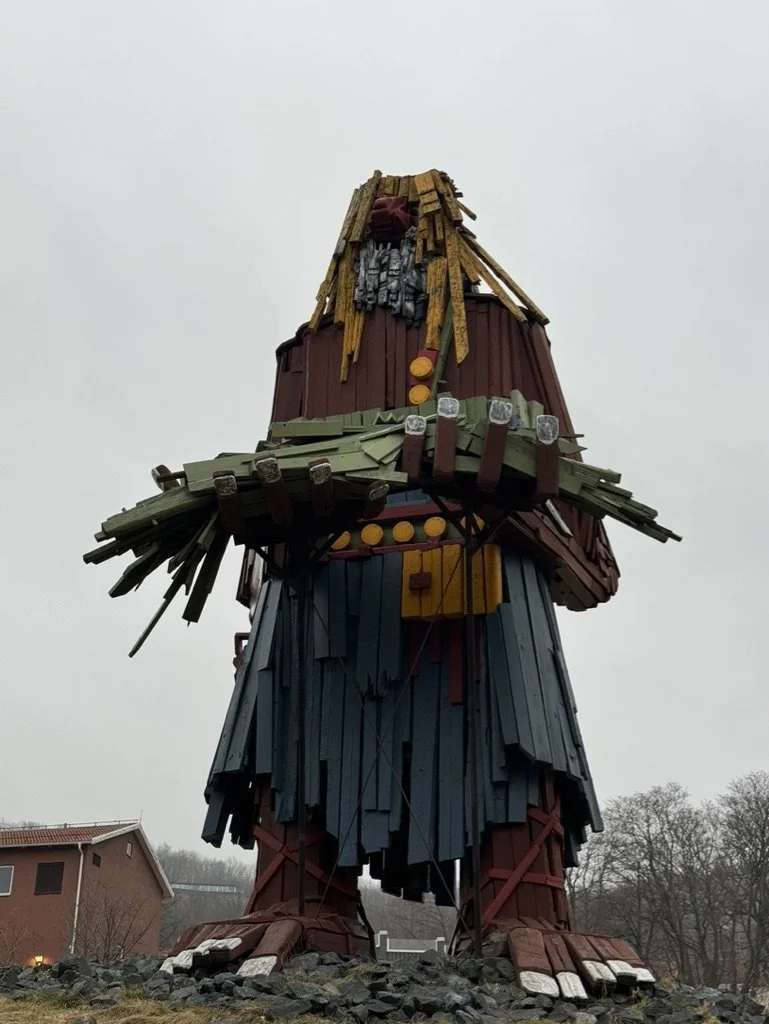 Visitors encounter a genuine cultural-historical environment with wooden houses from the 1700s and 1800s and a series of industrial remnants along the dramatic yet beautiful Röttleån ravine. The name Röttle is derived from Röttleån, the roaring rapids, as it was called in medieval times. The oldest evidence of the name and mills along the stream dates back to 1279. The stream is just over twelve kilometers long and serves as the natural drainage for the Ören and Bunn lakes, with a drop of 108 meters. The last four kilometers have a drop of 74 meters. A power station built in 1923 in Gränna has altered the stream's water flow, making it less than before. In medieval times, there were several mills here, including those owned by Nydala Monastery. Count Per Brahe the Younger became the owner of Röttle village in 1641. He invested in expanding water power, and an industrial area was established with various workshops along the stream, including a weapons forge. There were rope-making stamp mills, gunpowder mills, blacksmith shops, polishing mills, and drill mills. A paper mill was established and operated from 1646 to 1879. In the ravine, traces of old foundations and dams are visible. Two mills still exist. On the west side of the stream is Jerusalems kvarn, likely with medieval parts in the building. 150 meters upstream is Rasmus kvarn, whose building from the 1650s was initially a drill mill for manufacturing muskets but was converted into a flour mill around 1700. The mill was restored in 1977 and operates with water wheel power. The settlement consists of red-painted, old-fashioned, timbered cottages and duplexes, one or two stories high, from the 1700s and 1800s. Down by the stream's outlet into Lake Vättern is Röttle harbor with the steamboat dock where steamboats docked until the 1930s. Mill tours can be booked through Grenna Museum. Rest areas are arranged, and there are hiking trails through Röttle. The area is a nature reserve with hiking trails. https://jonkopingslansmuseum.se/se-och-gora/smultronstallen/jonkoping/rottle-by/. They had a large parking area with a path that led downhill to the river. There is a few docks and another path that takes you along the river to a waterfall. It was a peaceful place this time of year but I imagine it's a bit busier during the spring/summer. There is a really nice looking hotel on the site as well that appears to be converted from a castle. The last stop of the day was Vist the Giant which was completed in 1969 and standing over 11 metres (36 ft) high next to the European route E4, at Huskvarna. According to the legend, the giant was on the way home from a party in Västergötland. He threw some grass and soil into lake Vättern for his wife to step on, thus creating the island Visingsö.[2][3]https://en.wikipedia.org/wiki/Calle_%C3%96rnemark