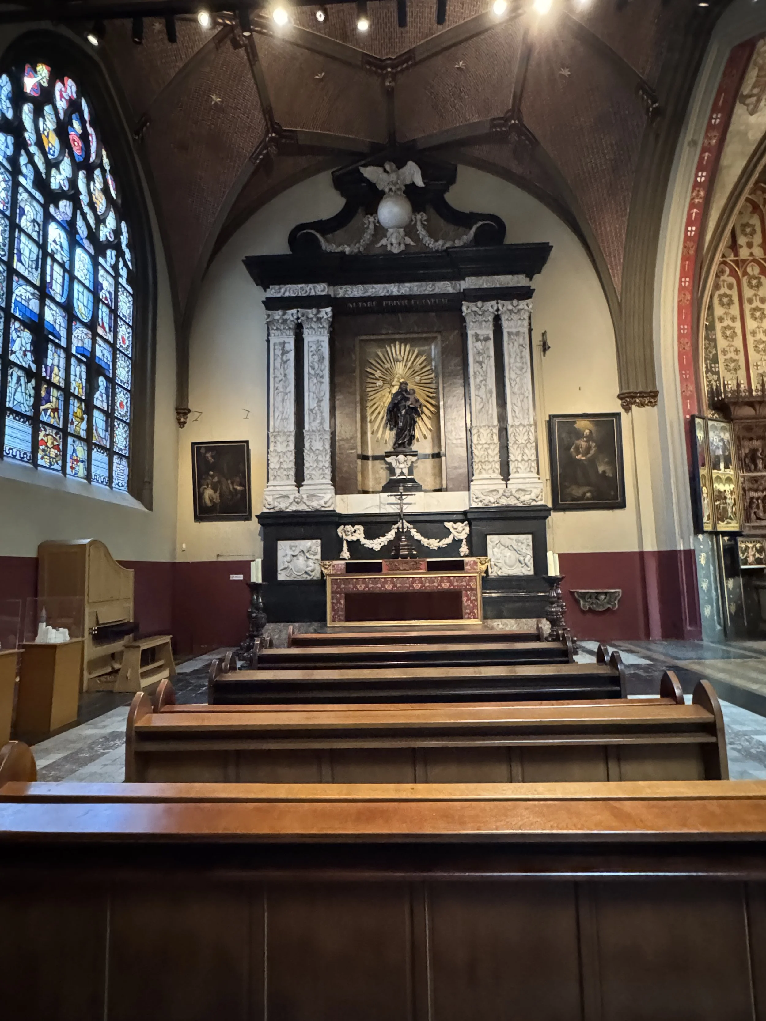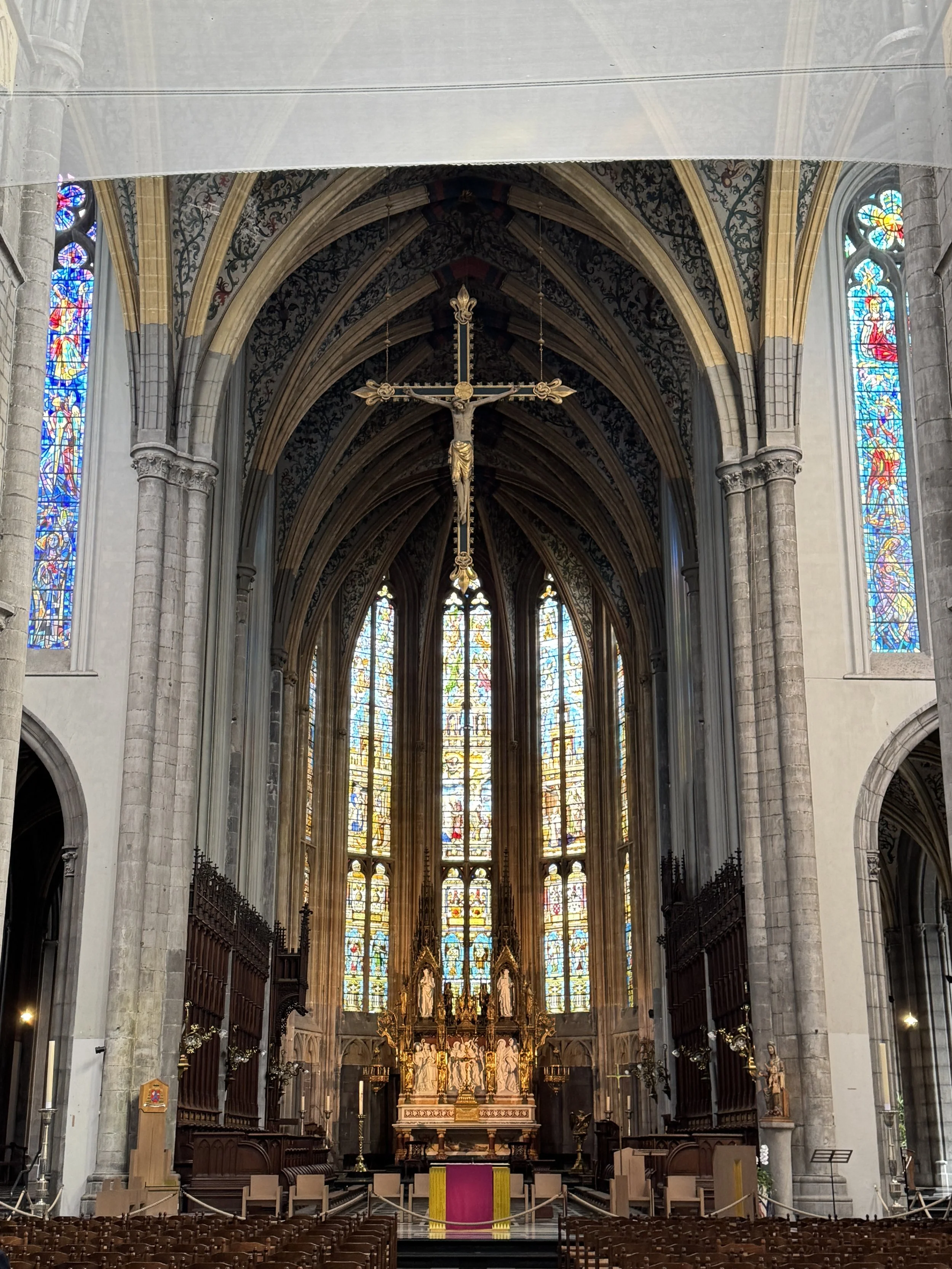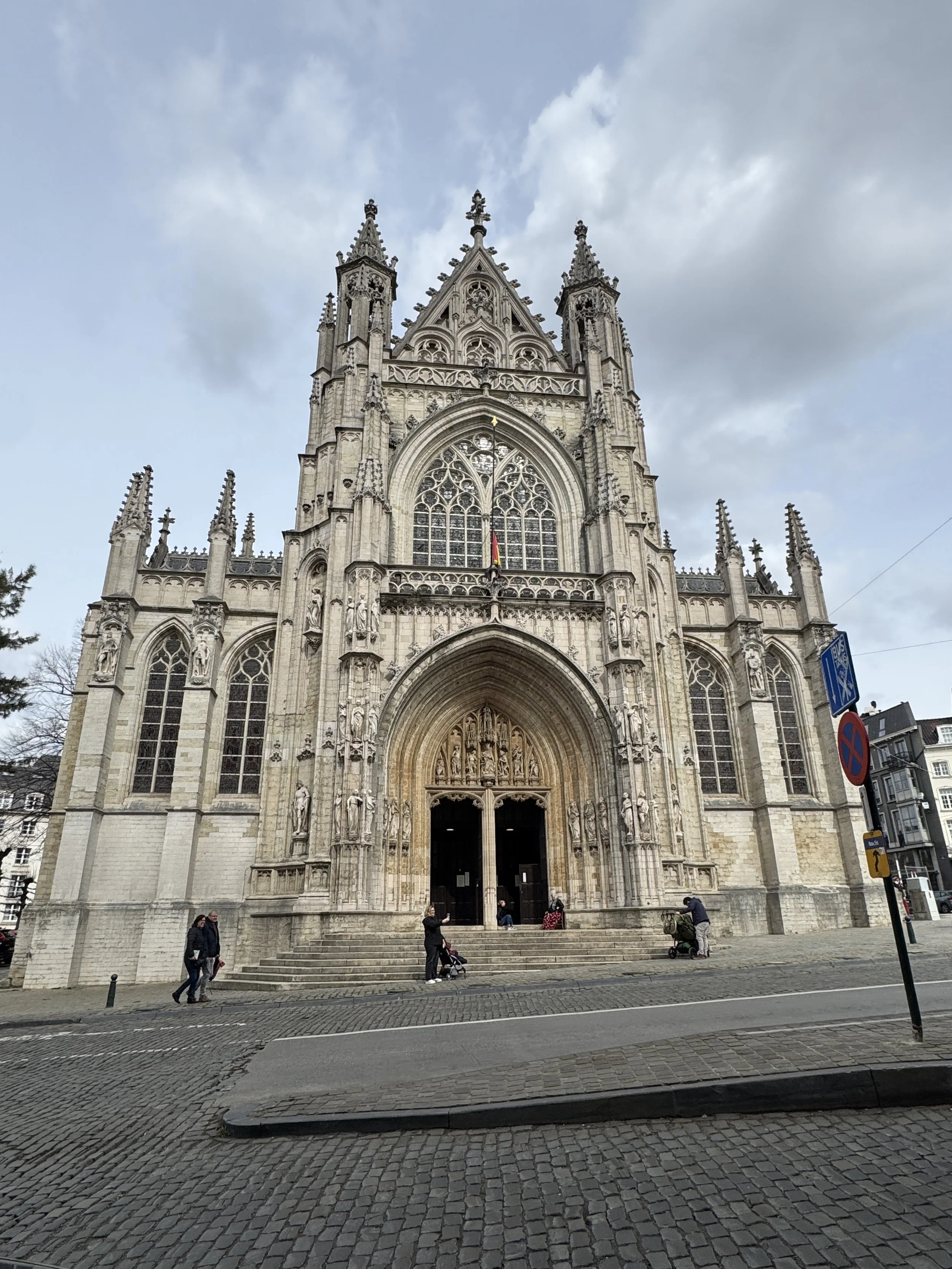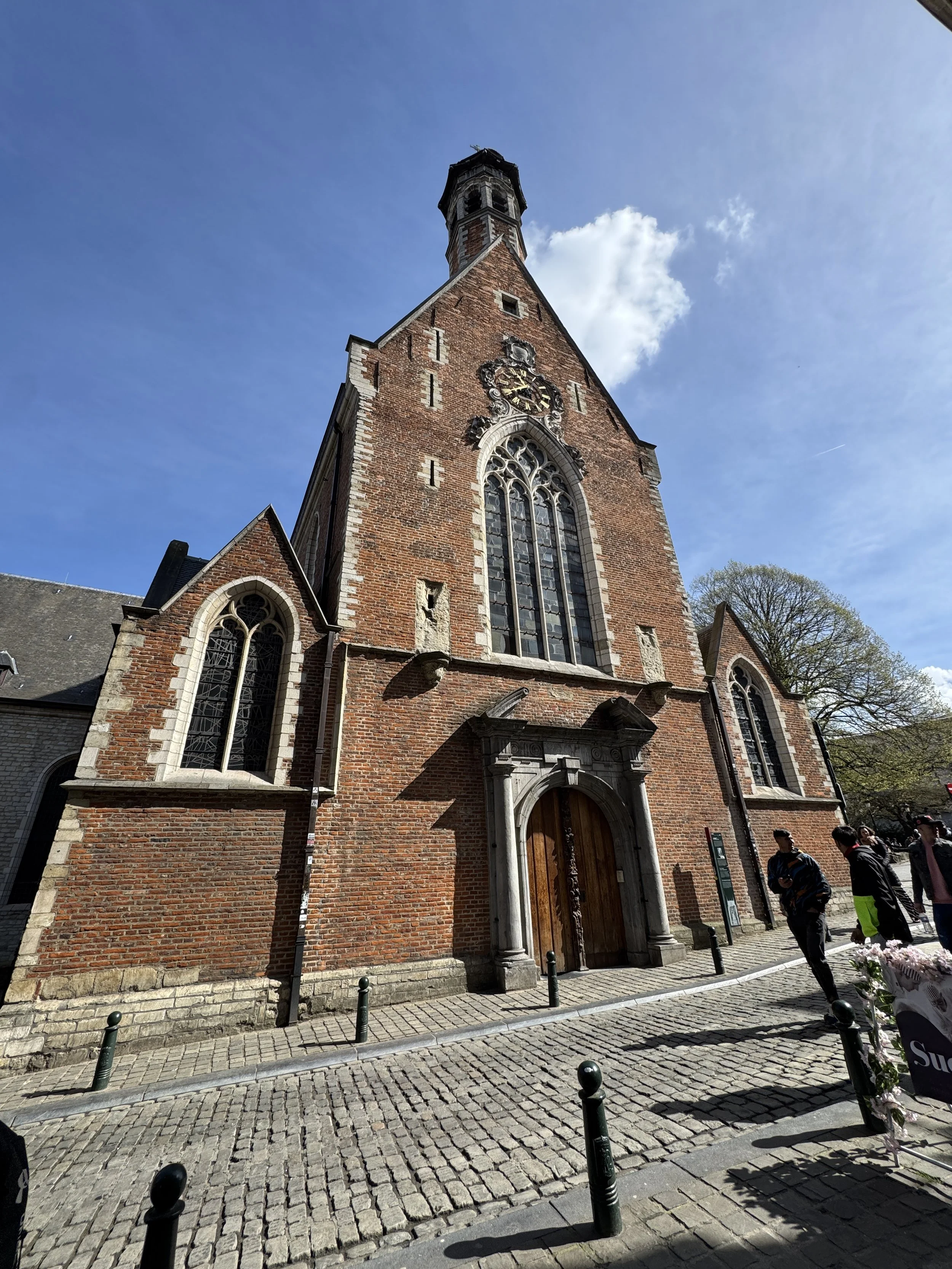 Next stop was Église Notre-Dame des Victoires au Sablon, built in the 15th century. It started as a chapel for a crossbowmen’s guild and became one of the finest examples of Brabantine Gothic architecture. Its name comes from a legend involving a sacred statue of the Virgin Mary. It’s tied to elite guilds and has beautiful stained glass. The exterior and interior were both impressive. It’s open to the public, but some areas are reserved for prayer.