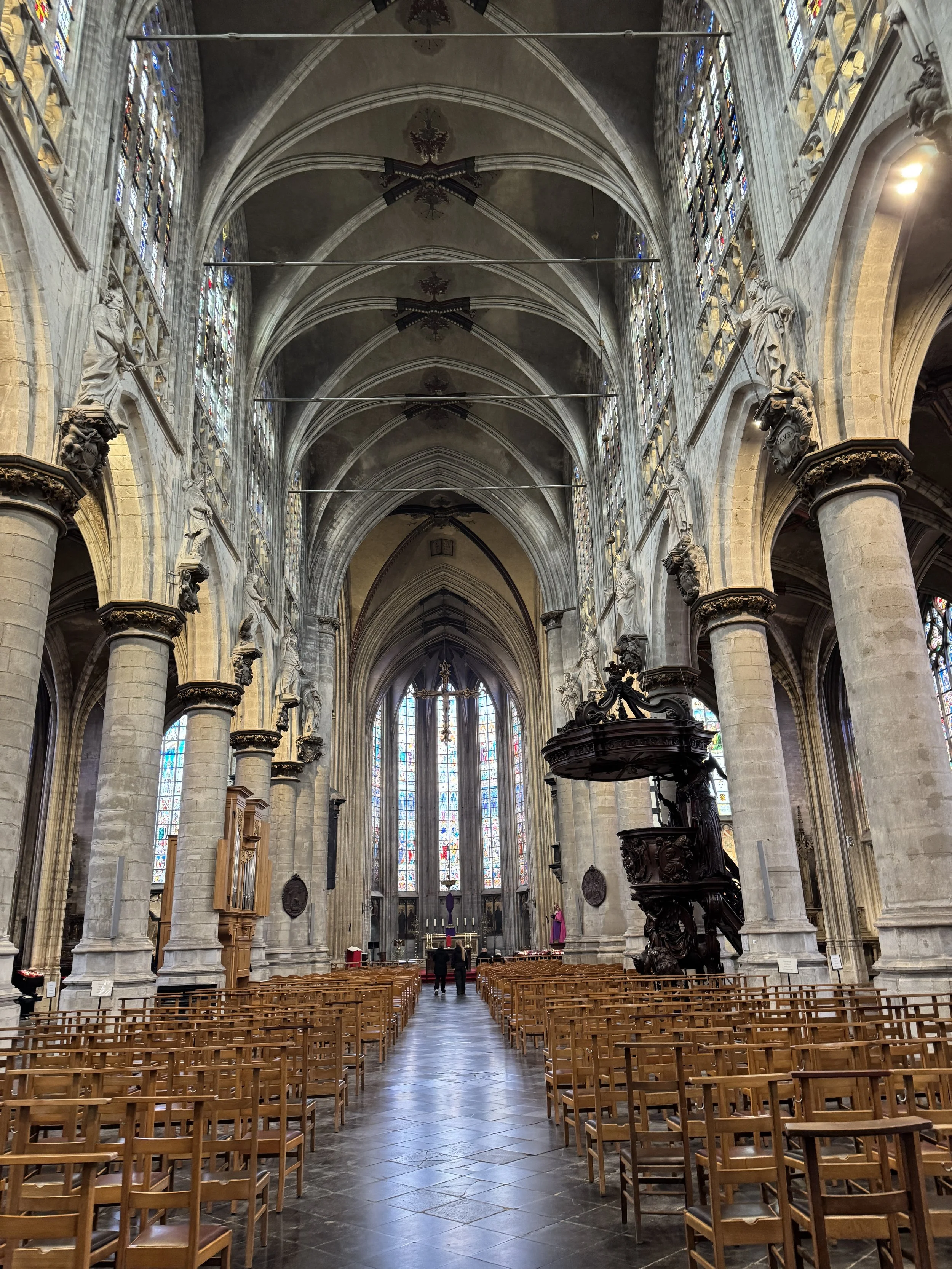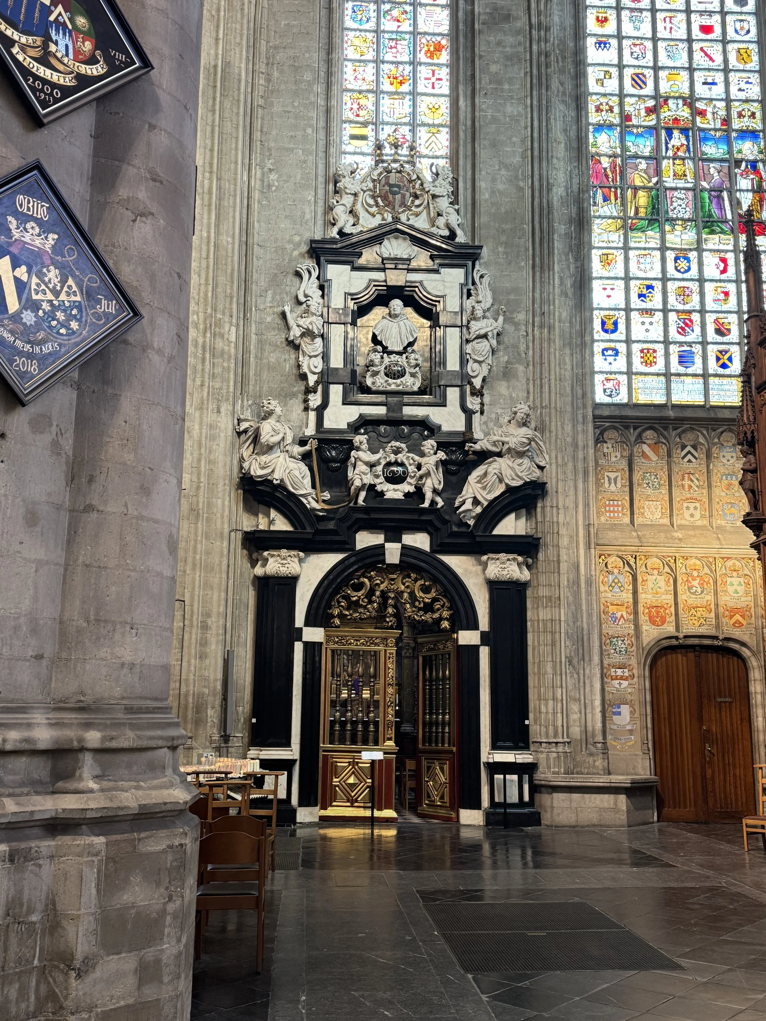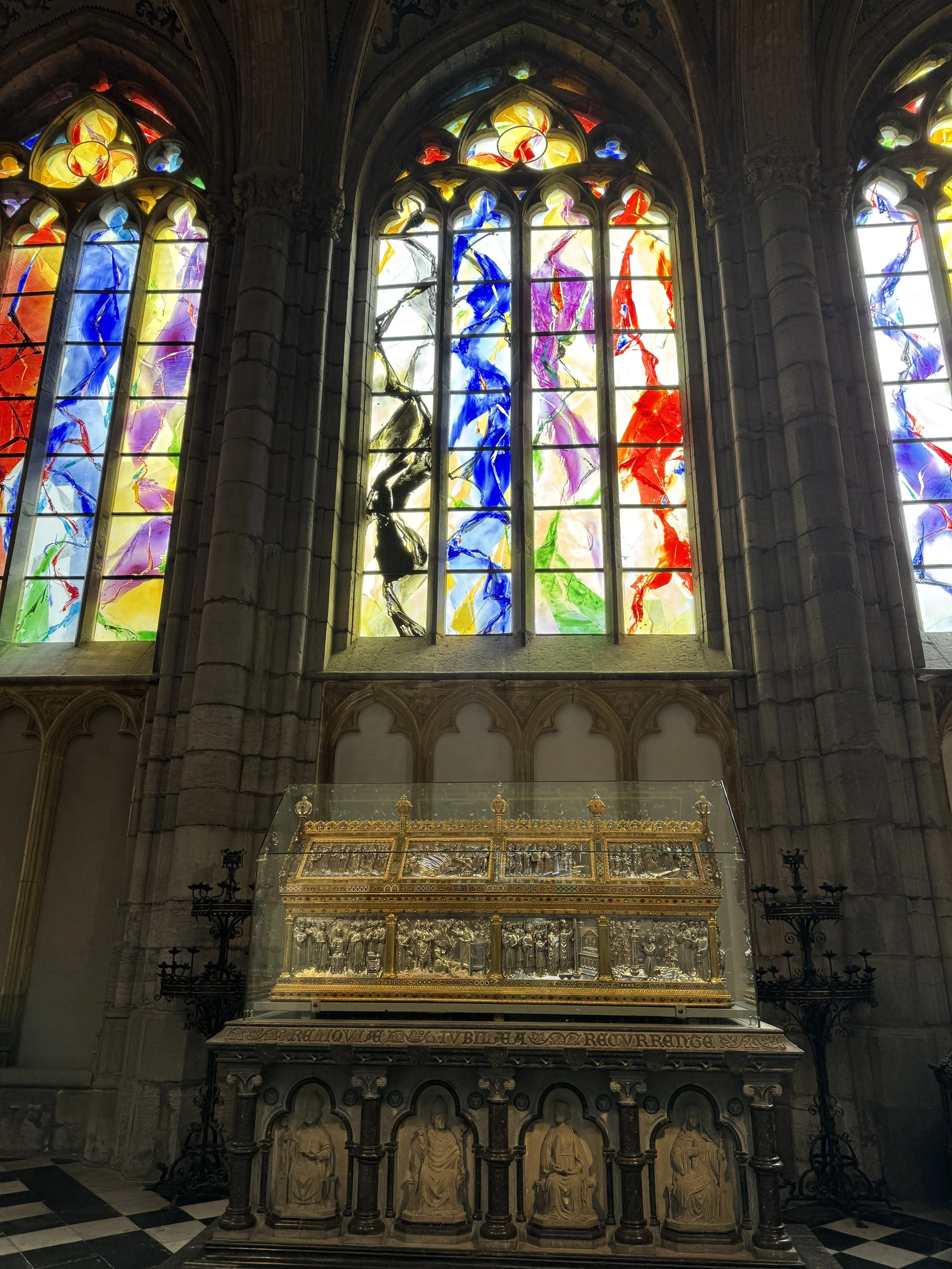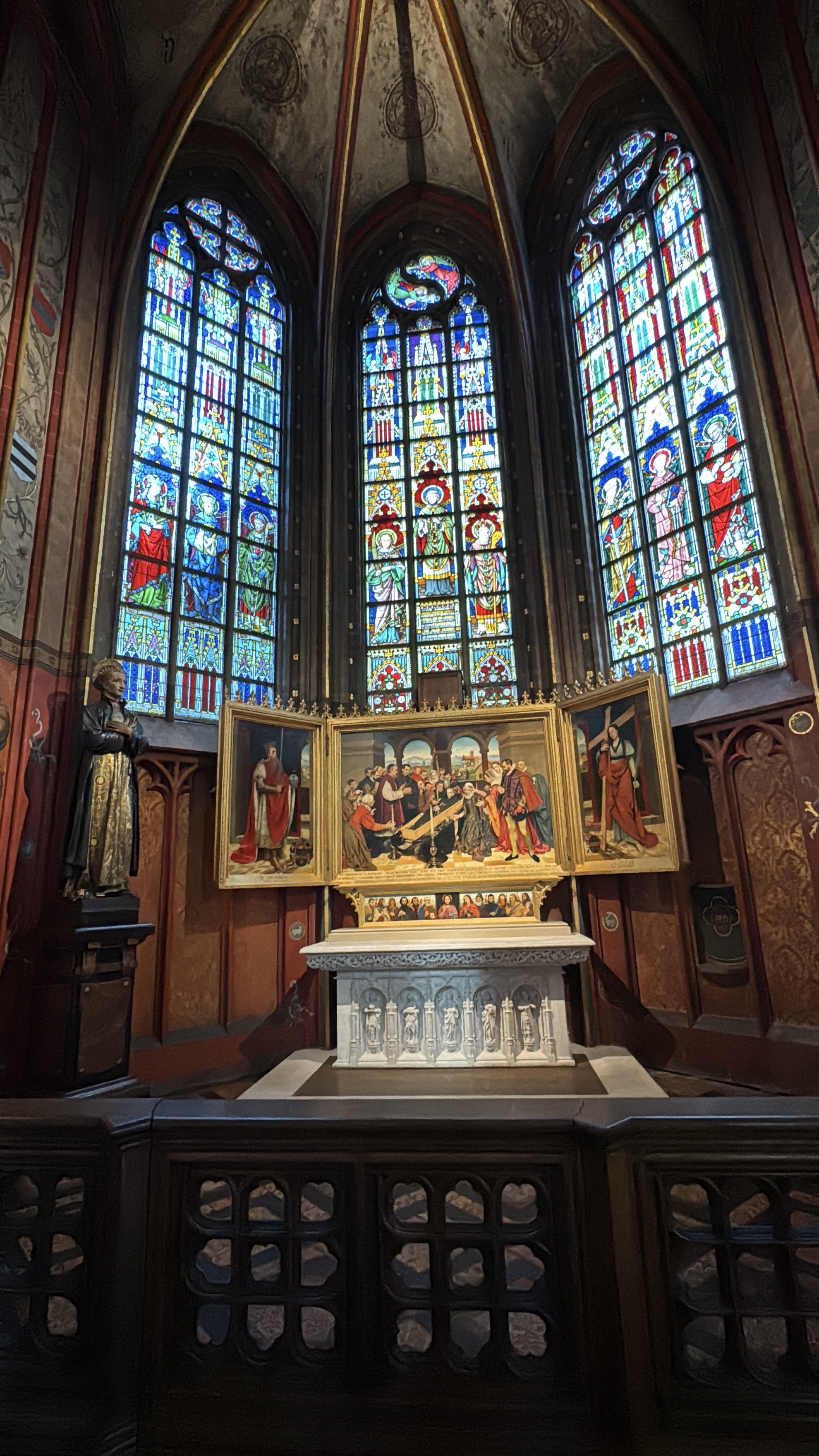 Next stop was Église Notre-Dame des Victoires au Sablon, built in the 15th century. It started as a chapel for a crossbowmen’s guild and became one of the finest examples of Brabantine Gothic architecture. Its name comes from a legend involving a sacred statue of the Virgin Mary. It’s tied to elite guilds and has beautiful stained glass. The exterior and interior were both impressive. It’s open to the public, but some areas are reserved for prayer.