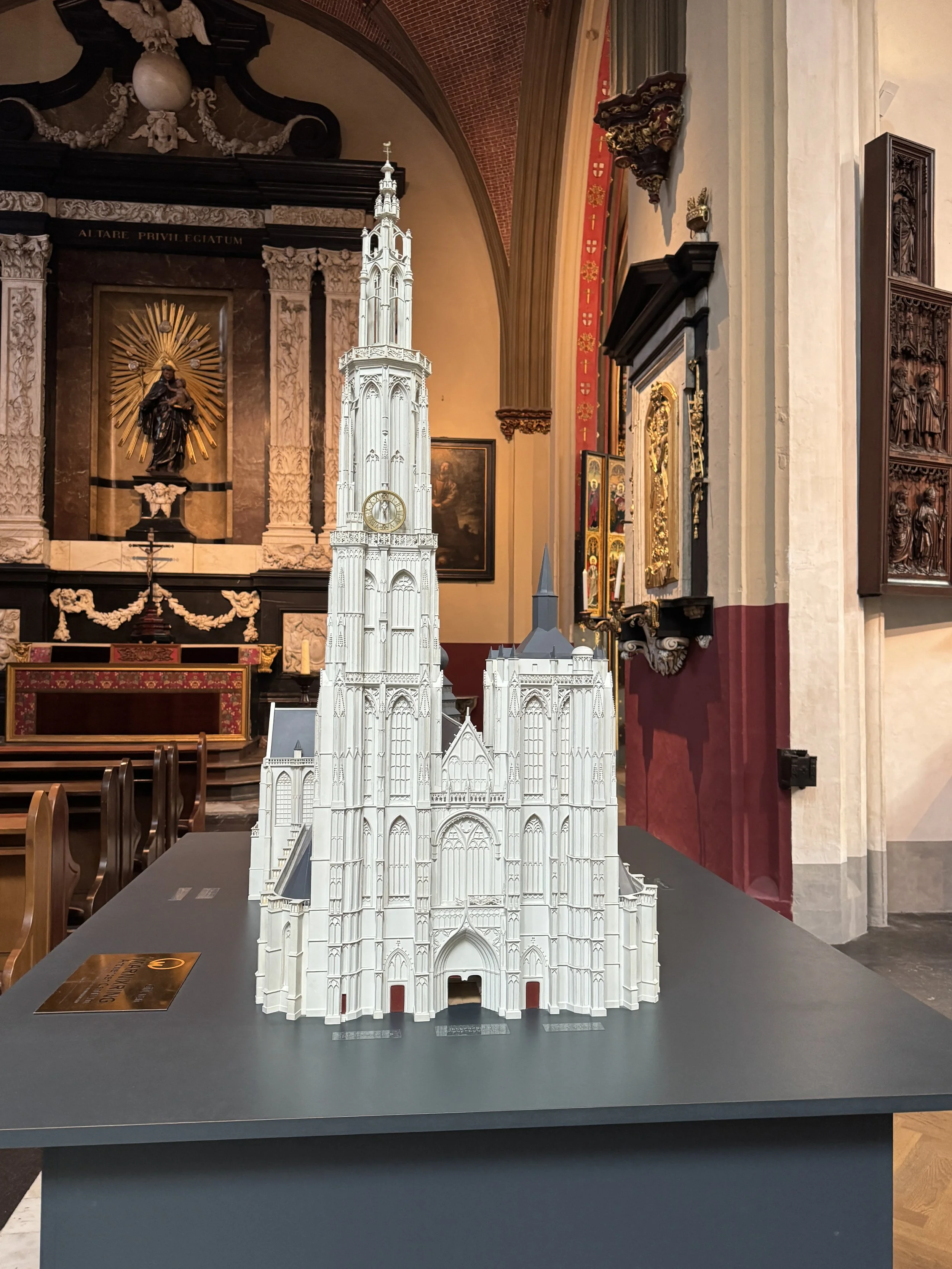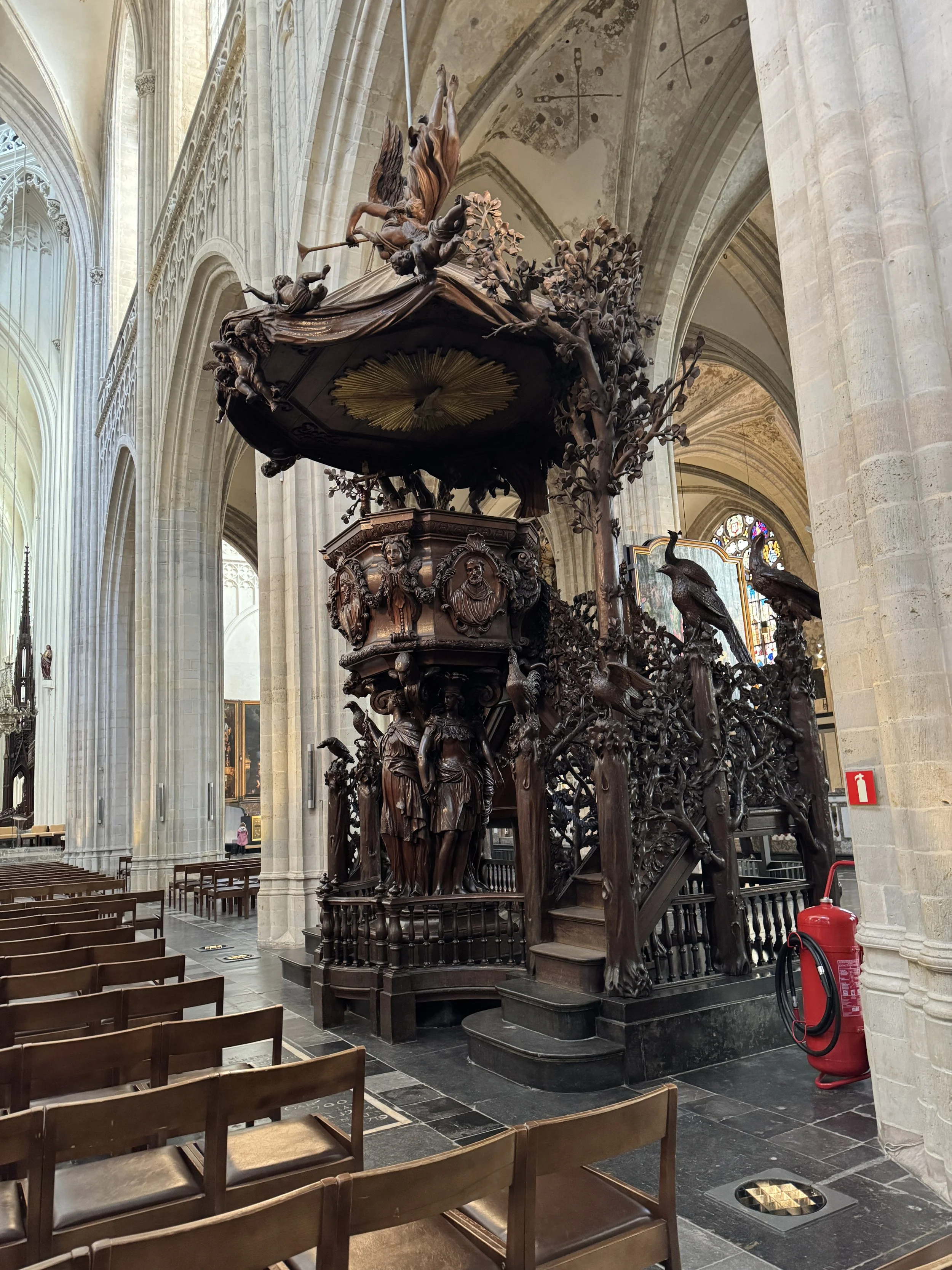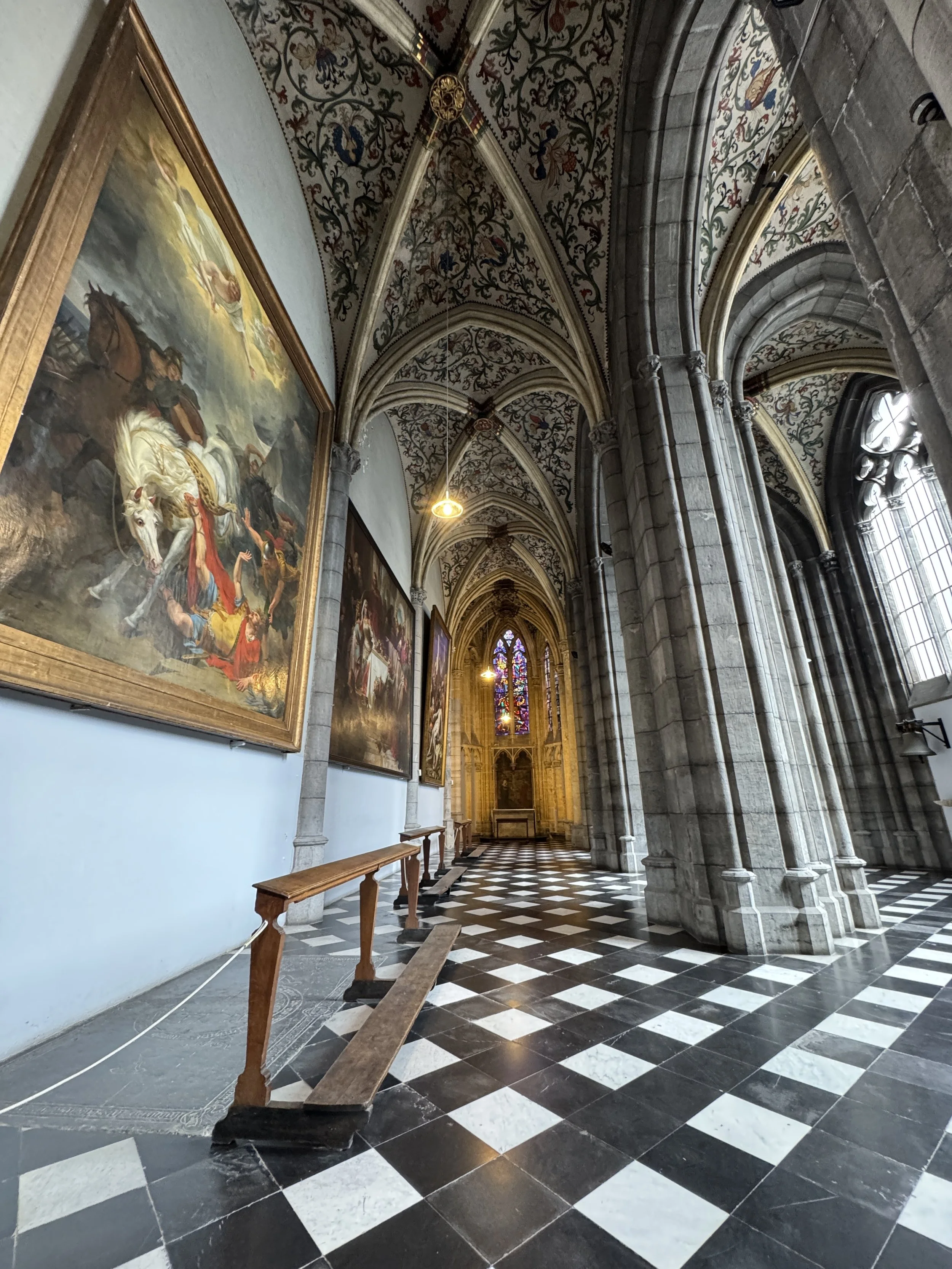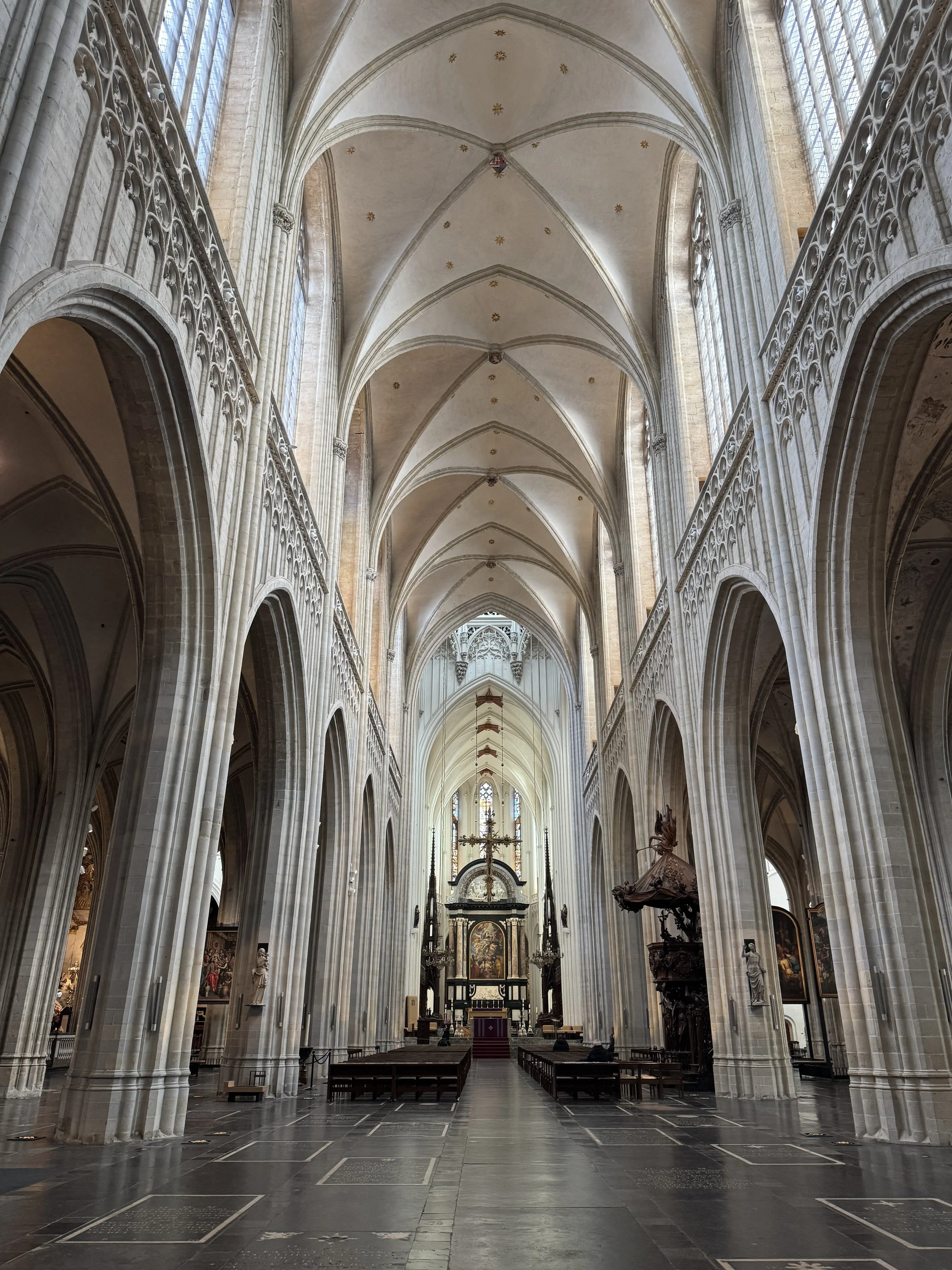 Next stop was Église Notre-Dame des Victoires au Sablon, built in the 15th century. It started as a chapel for a crossbowmen’s guild and became one of the finest examples of Brabantine Gothic architecture. Its name comes from a legend involving a sacred statue of the Virgin Mary. It’s tied to elite guilds and has beautiful stained glass. The exterior and interior were both impressive. It’s open to the public, but some areas are reserved for prayer.