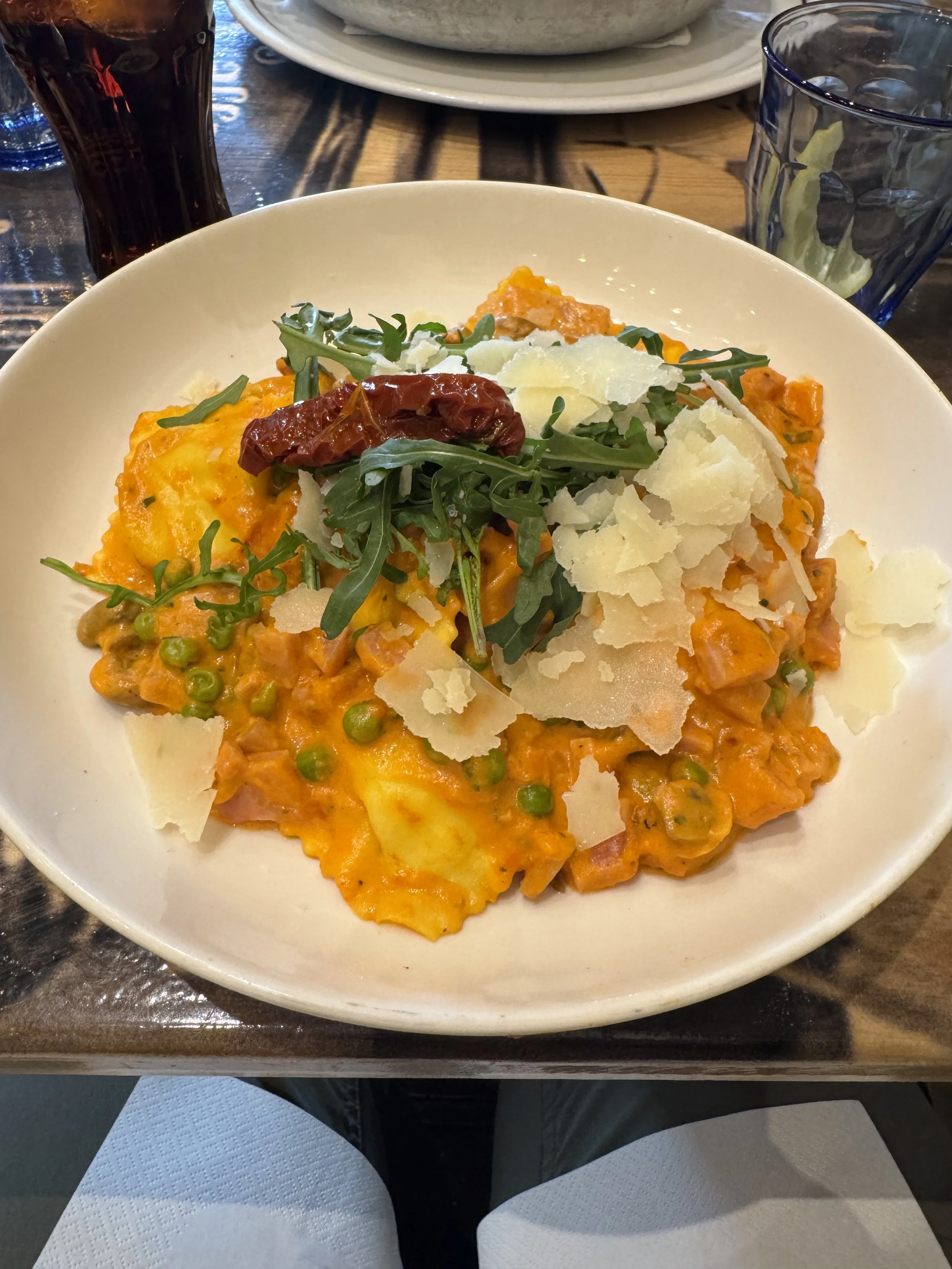We headed to Ricotta et Parmesan for lunch because they offer gluten-free pasta options. You can either order from the menu or build your own pasta. I went with goat cheese and mushroom-filled ravioli with a ricotta cream, pea, and pancetta sauce.