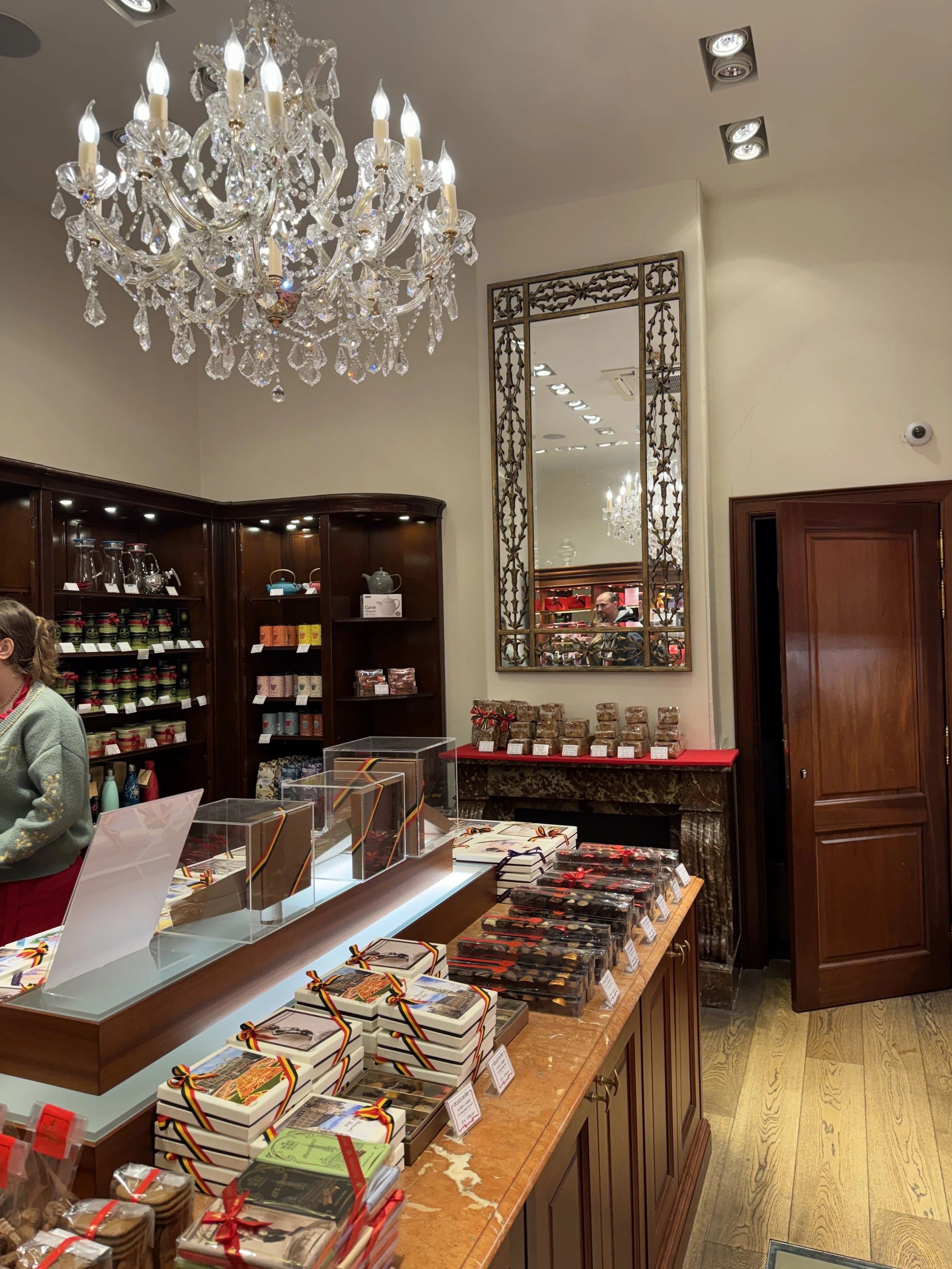 Next was Les Délices du Roy, which had a much more bougie vibe with red and gold décor and expensive loose teas (they did offer tea samples). I broke my rule here because they had beer-filled chocolates, which was an automatic yes since my boyfriend brews in his spare time. He already thinks I’m crazy for being in Belgium and not trying all the beer, so this felt like a compromise.