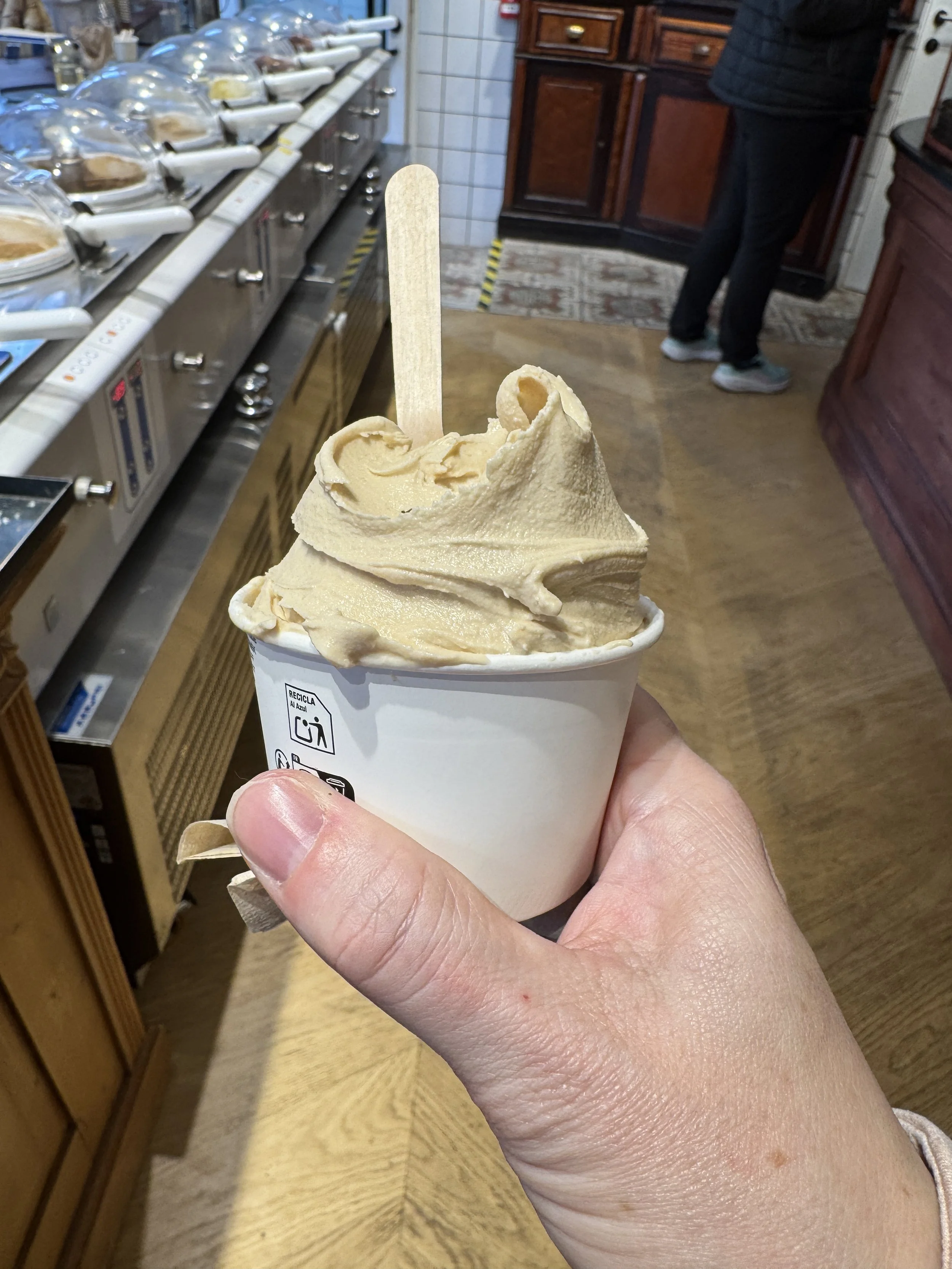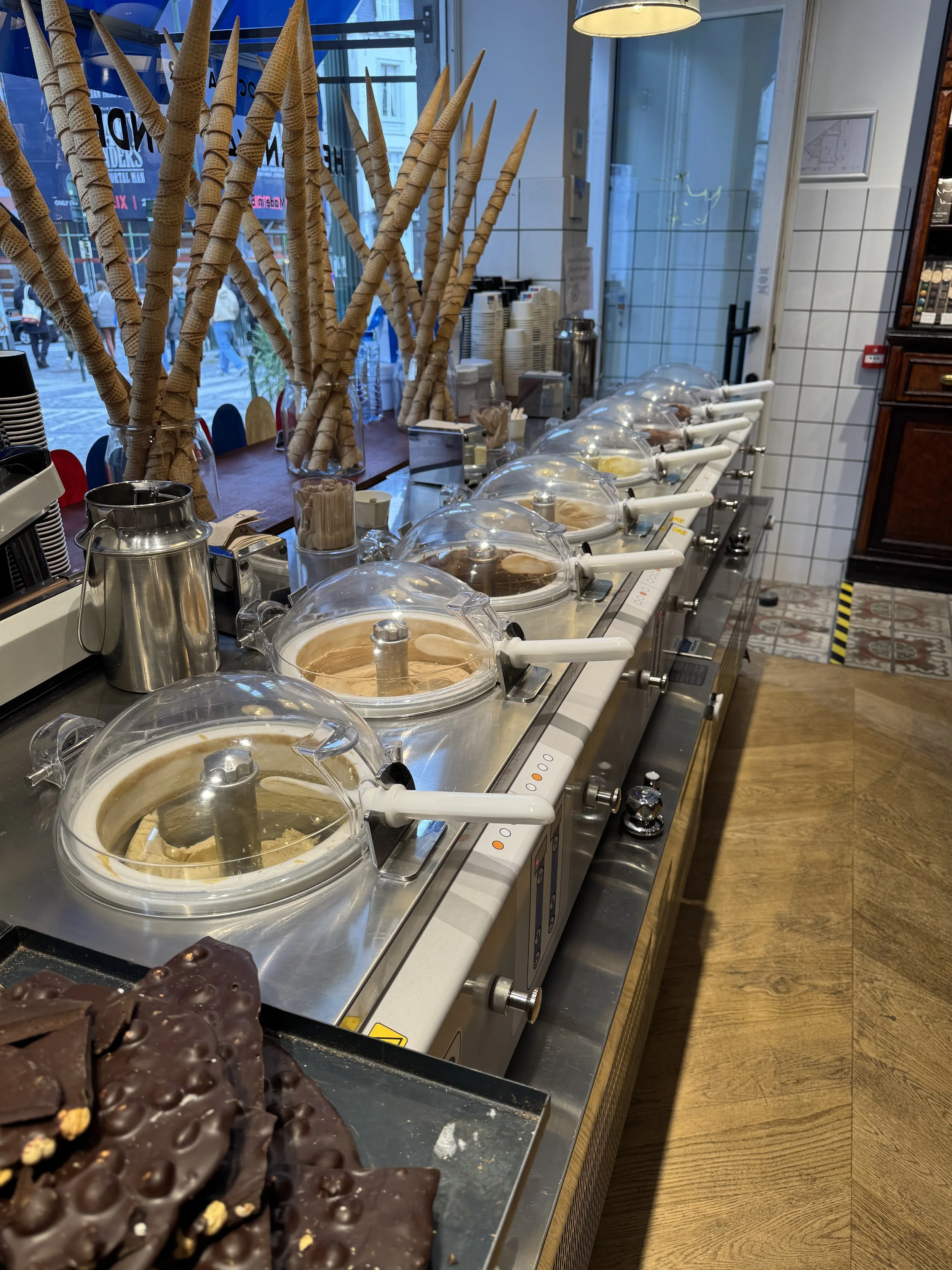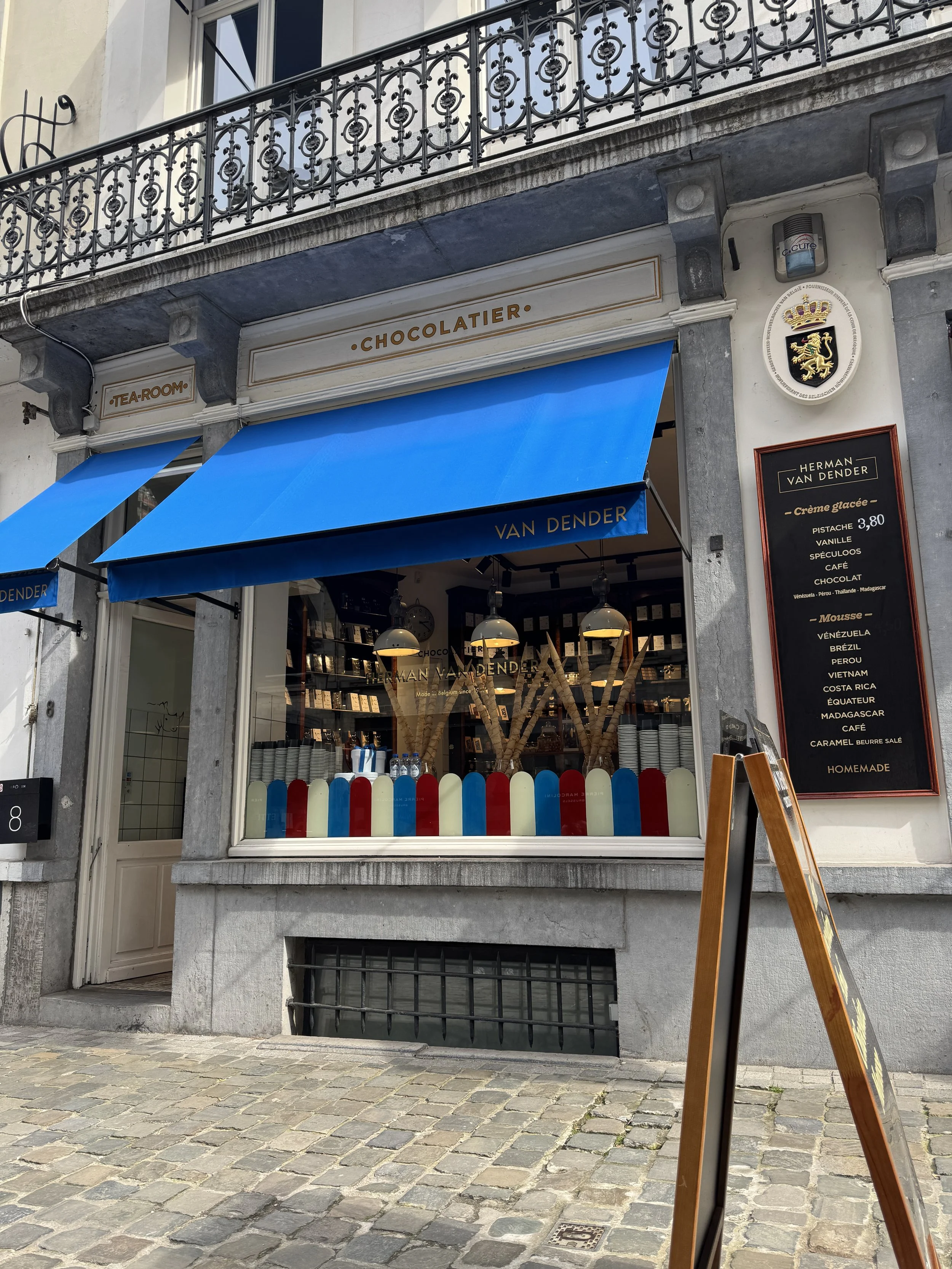 We kept moving and passed Herman Van Dender, which pulled us in immediately. They had a chocolate fountain wall display and a very tempting ice cream case. The employee offered samples, and I tried the Biscoff flavor—it was amazing. Think gelato texture but technically ice cream. No chocolate samples though, so I stuck with ice cream. The shop had a very old-school vibe, even down to the uniforms.