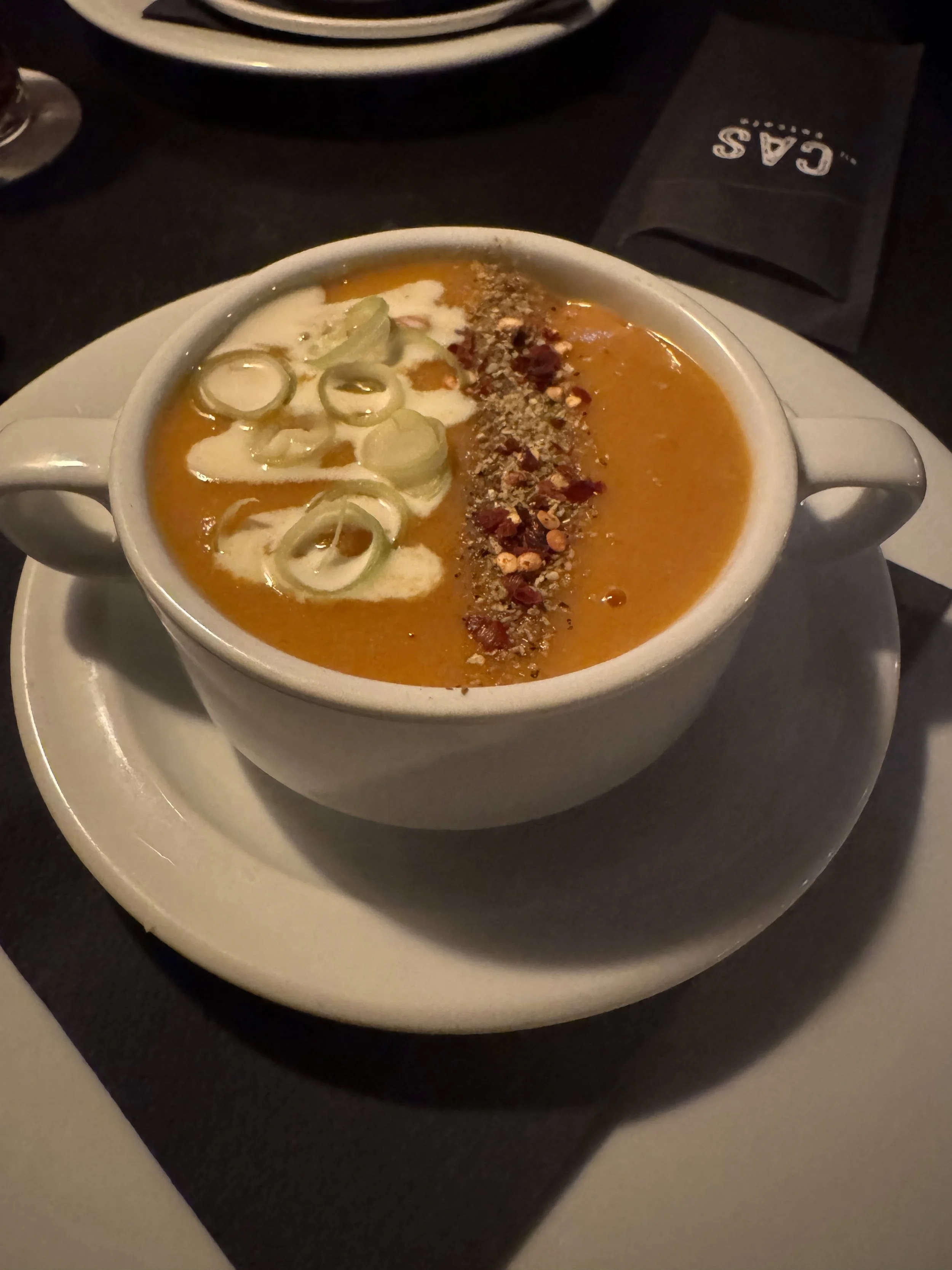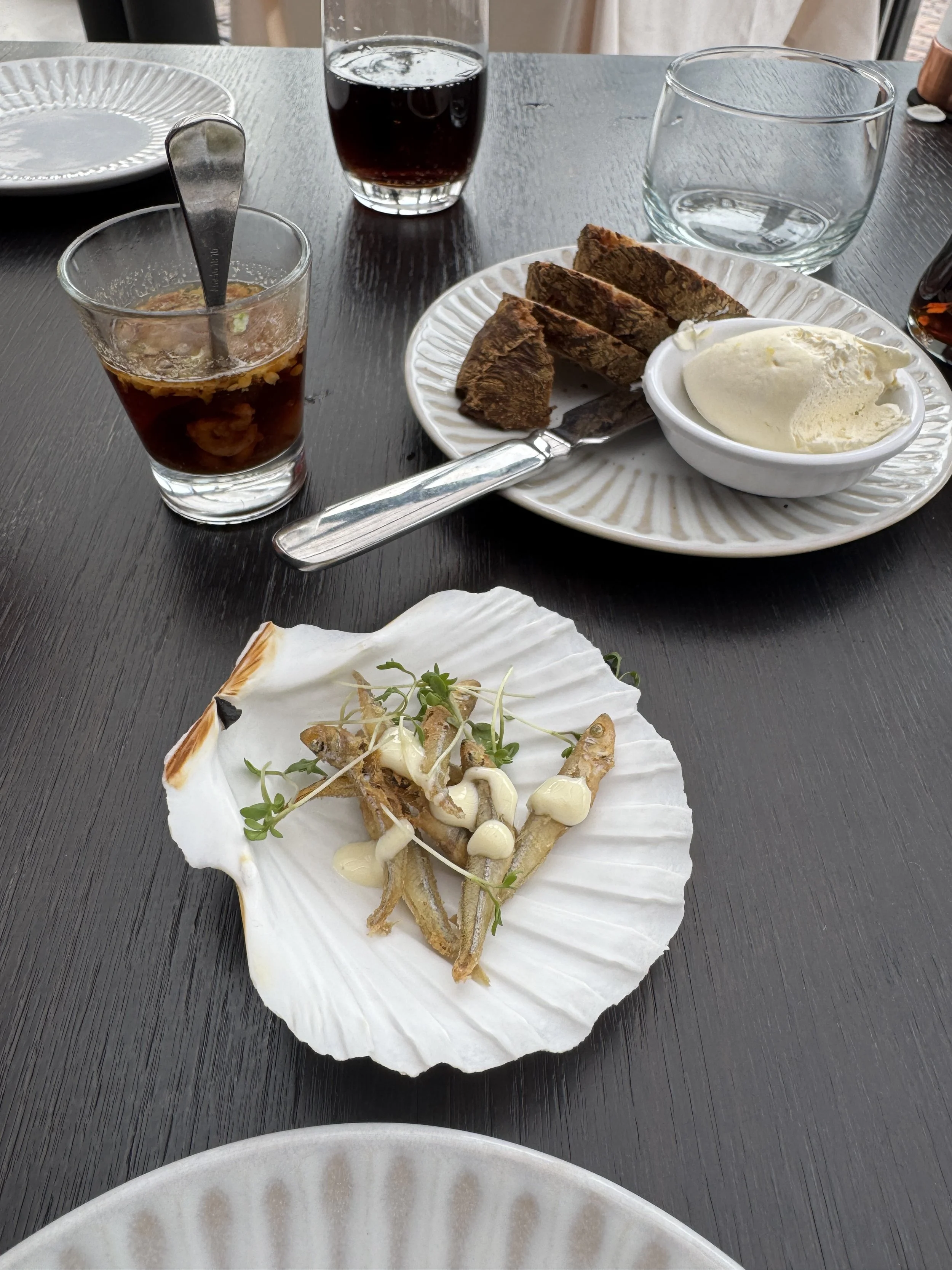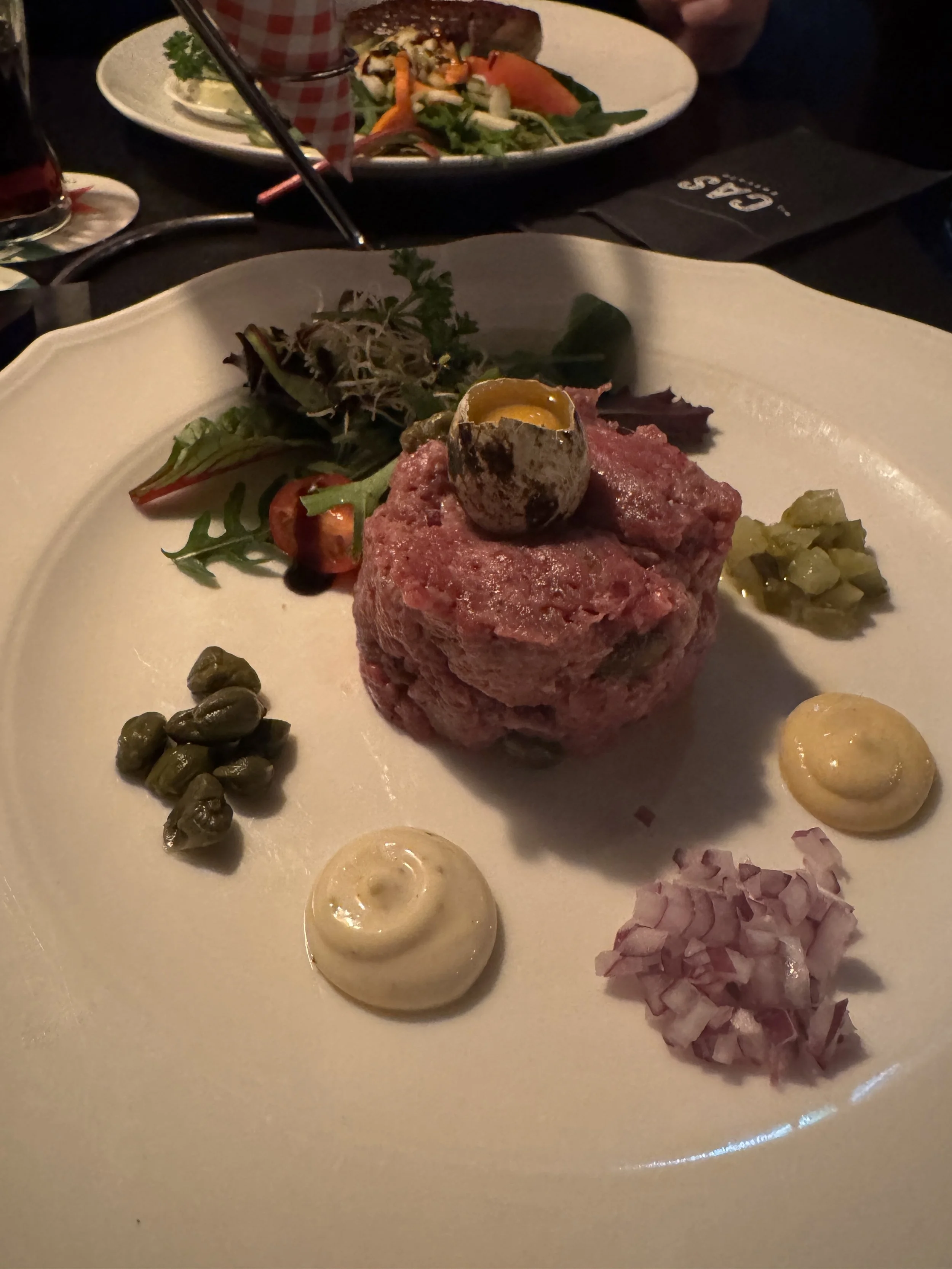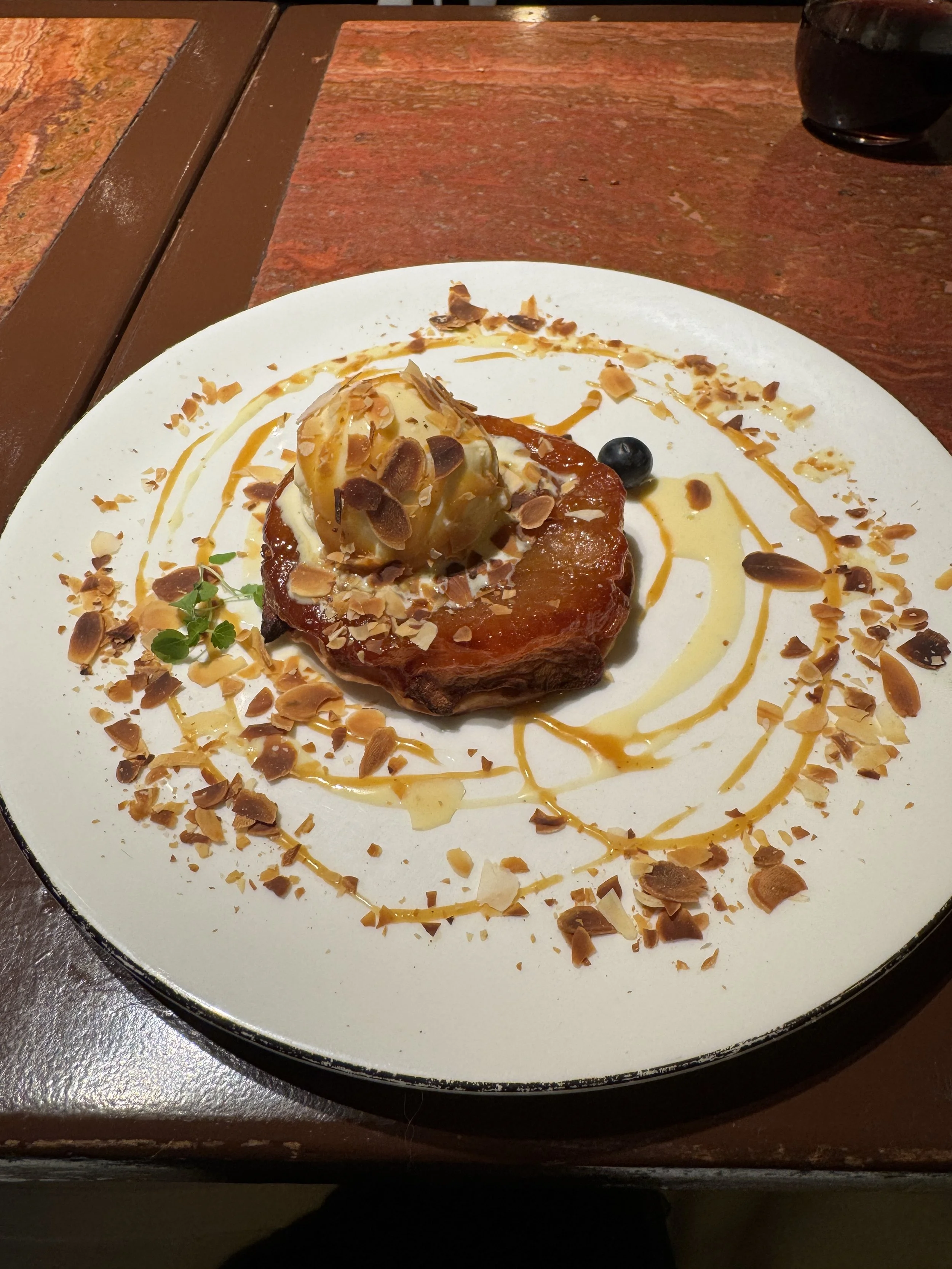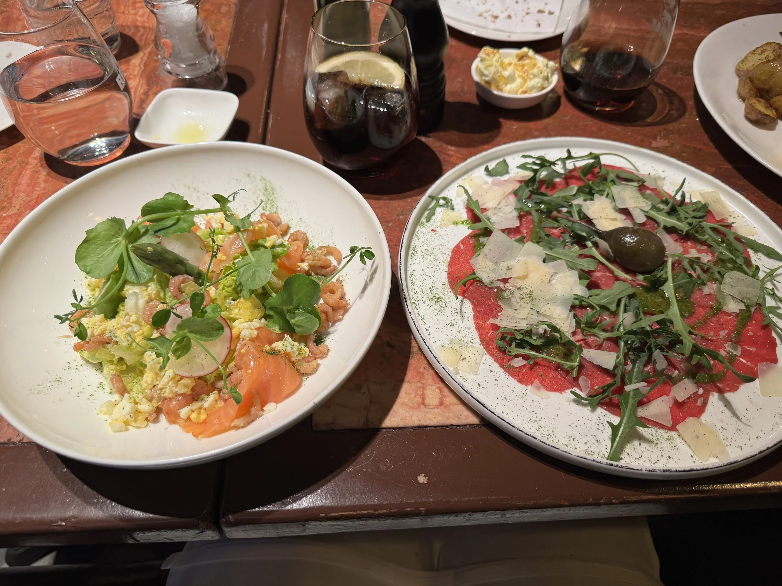 We had a 6:30 reservation at La Quincaillerie. I had a salad with smoked salmon, gray shrimp, and asparagus with a great dressing, plus beef carpaccio. Both were incredible. For dessert, I had a tartin that was perfectly gooey. The service was impeccable, and the whole experience was just… chef’s kiss.