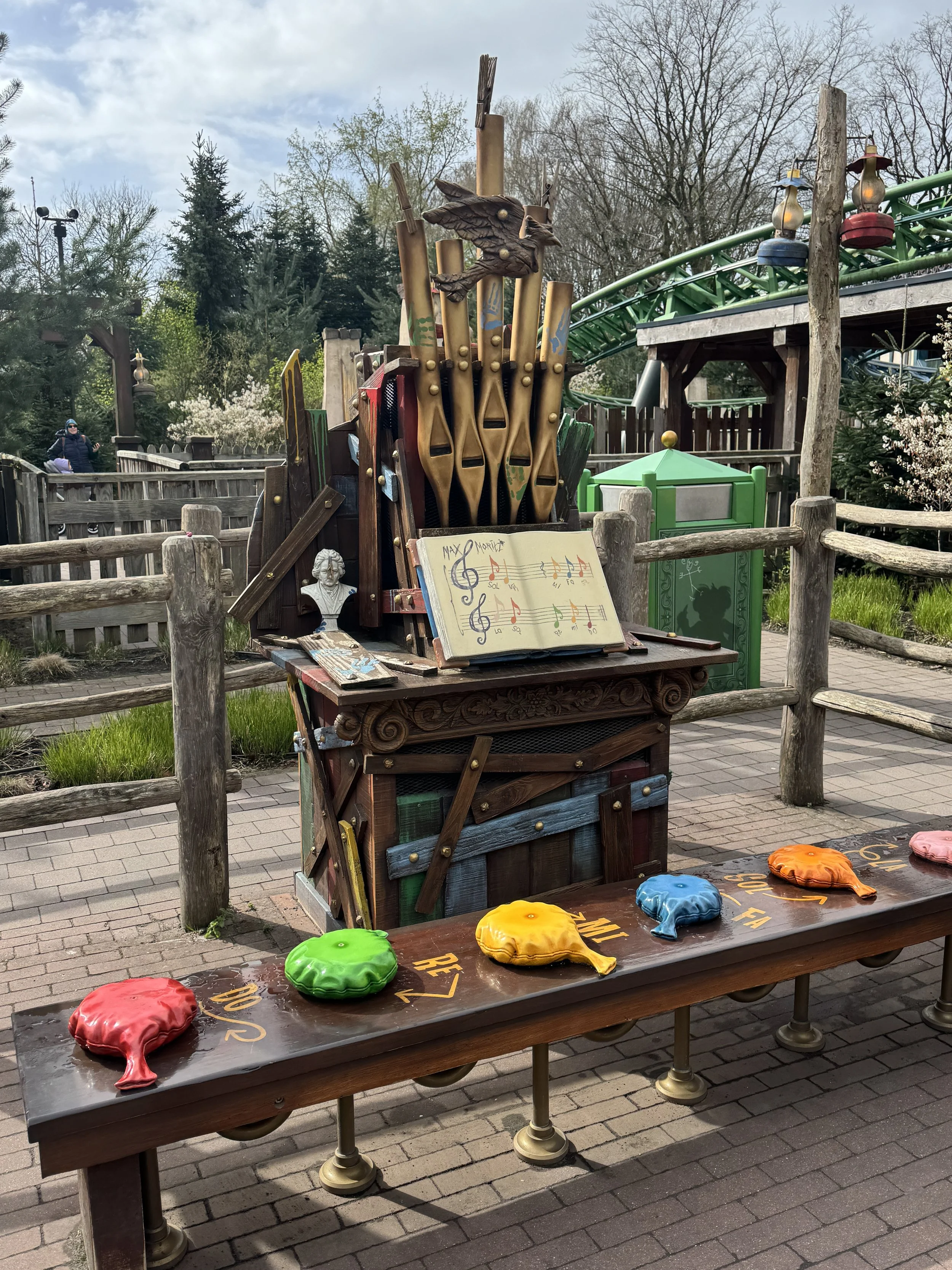 There are a ton of food options throughout the park. During one of the heavier rain bursts, we ducked into the Mystique Bar for brunch. I had baked eggs with chorizo and toast. It was… fine. Later in the day, I tried a cupcake, hot chocolate, doughnut, caramel crumble cake, and a pretzel. All were pretty “meh,” but affordable—cupcake €2.95, hot chocolate and doughnut €7, crumble cake and pretzel €8. Bottled water was €3.95. Honestly, still better pricing than U.S. theme parks.