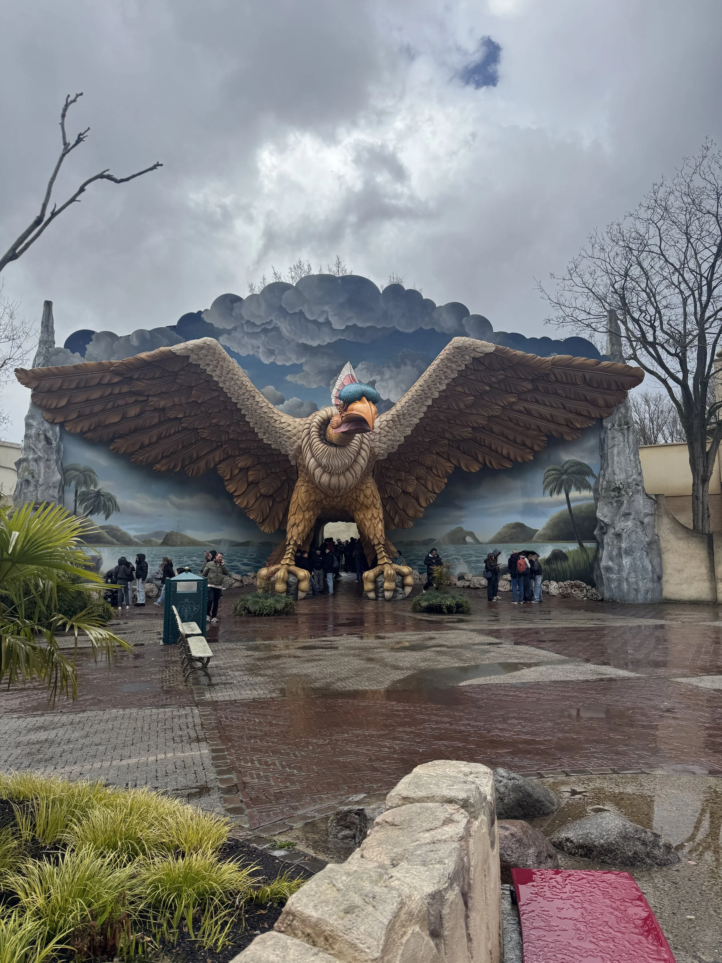 We rode Vogel Rok, an indoor roller coaster with an entrance under a massive flying bird. The ride is in complete darkness and lasts about 90 seconds. It was actually really fun, even though the darkness makes it a bit disorienting.