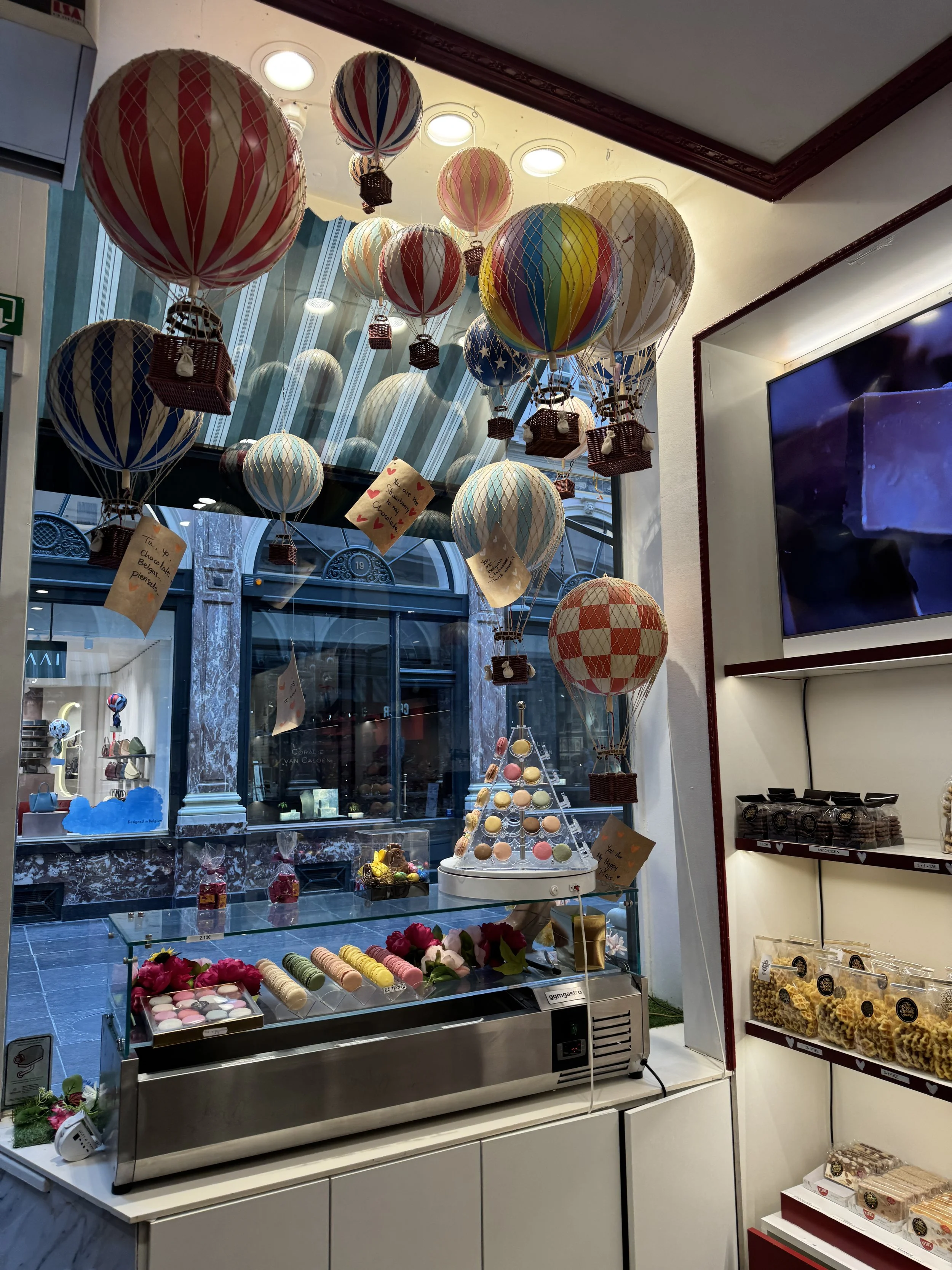 Our first stop was Belgium Chocolate Factory inside the gallery. It had a cute hot air balloon theme, offered samples, and had loose chocolates you could mix and match and pay by weight. I filled a box with anything that looked interesting.